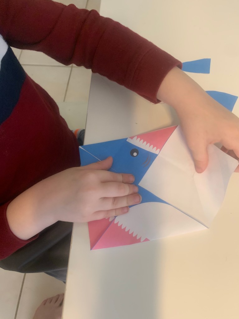 Today the craft was origami paper sharks. It was a mega simple one with regards to set up/clean up and supplies. It did require a printer to print out the template (link in supply list). However one wouldn’t necessarily absolutely need this. You could draw or color your own. Back when I was a kid in England we called these things fortune tellers. You wrote numbers on them and little fortunes inside like you’ll have 3 kids” then you’d make people choose numbers and roll around giggling on the floor for ages. Oh 1996 you were good to me. The website I got this template from refers to them as “Cootie Catchers”. Frankly every single thing about this name makes me cringe. However my friend Marielle, source of all knowledge, tells me that when they’re not being used to tell you your future, this is in fact their name. Gross. Let’s just call them shark origami and never talk of this again. The boys pretty successfully cut out their template squares, however only William mangled the fins. I cut Teddy’s for him. Another hand hint I discovered was that if you draw a mark in the center on the soarer it makes it easier for kids to have something “to aim for” when folding in their corners.