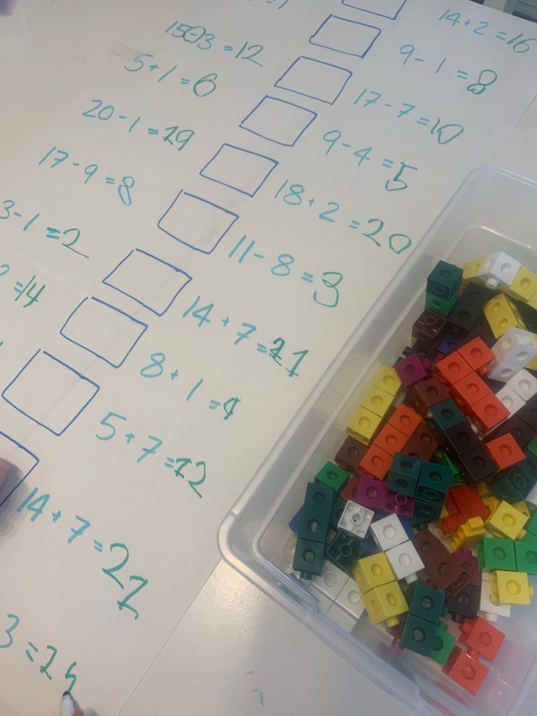 At the other end of the table was William. He had a shark “More than/less than” game that I invented about 9 minutes before he sat down. The basic premise was two math equations, either side of a square. He had to figure out the answers, then decide whether the left had equation was more than, or less than, the equation on the right. I made horrendously ugly little chubby sharks with their mouths in < and > shapes. Had I have had more time I would have searched the internet to print prettier ones, maybe added some teeth. I’ve attached a picture, feel free to screenshot it and use if desperate, but pretty much ANYONE could draw better ones! I put his number blocks out for him to use if he needed help with an equation. He actually didn’t use them, because his mental math is strong, so I need to up my game and look at some more complicated problems to give him. I highly recommend getting a set of unifix cubes for at home math. In the USA you can get them here and if you’re in the UK you can get them here. We use them all the time, and the boys like to just play and fiddle with them even when we’re not using them academically.