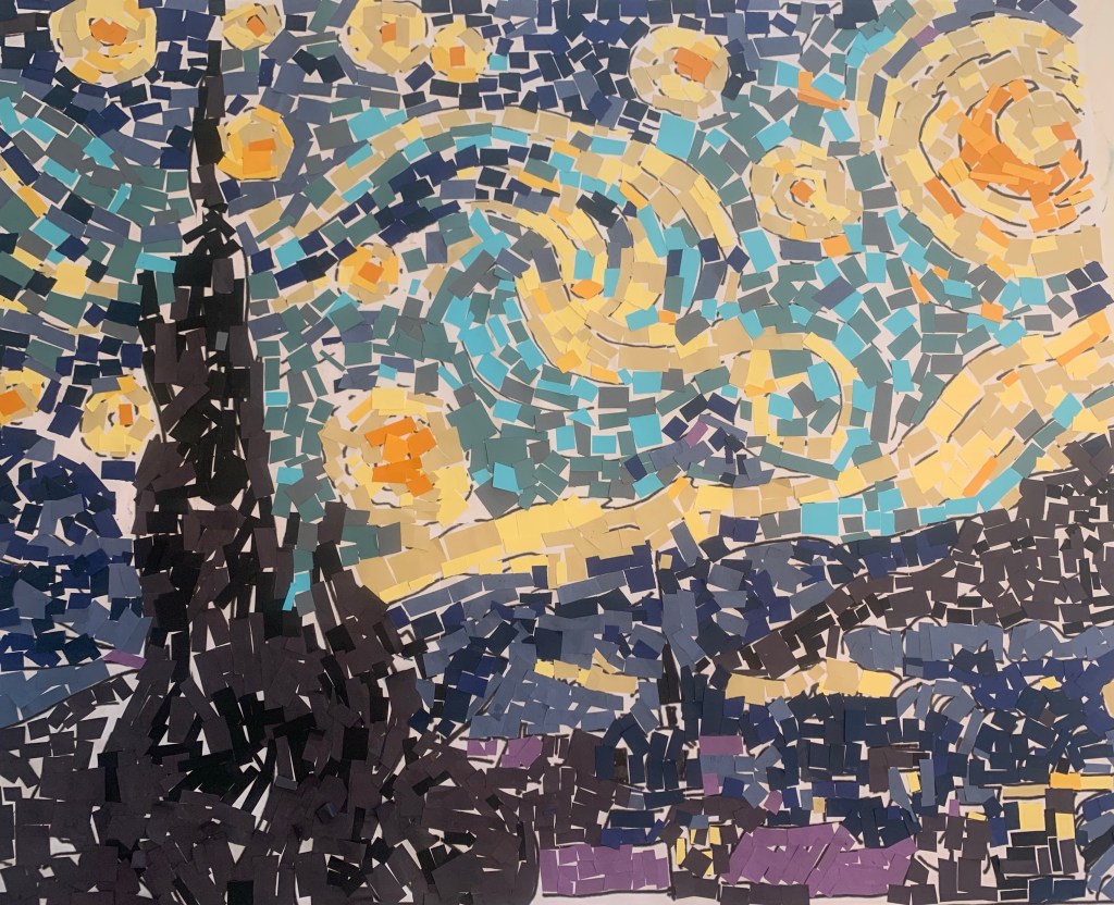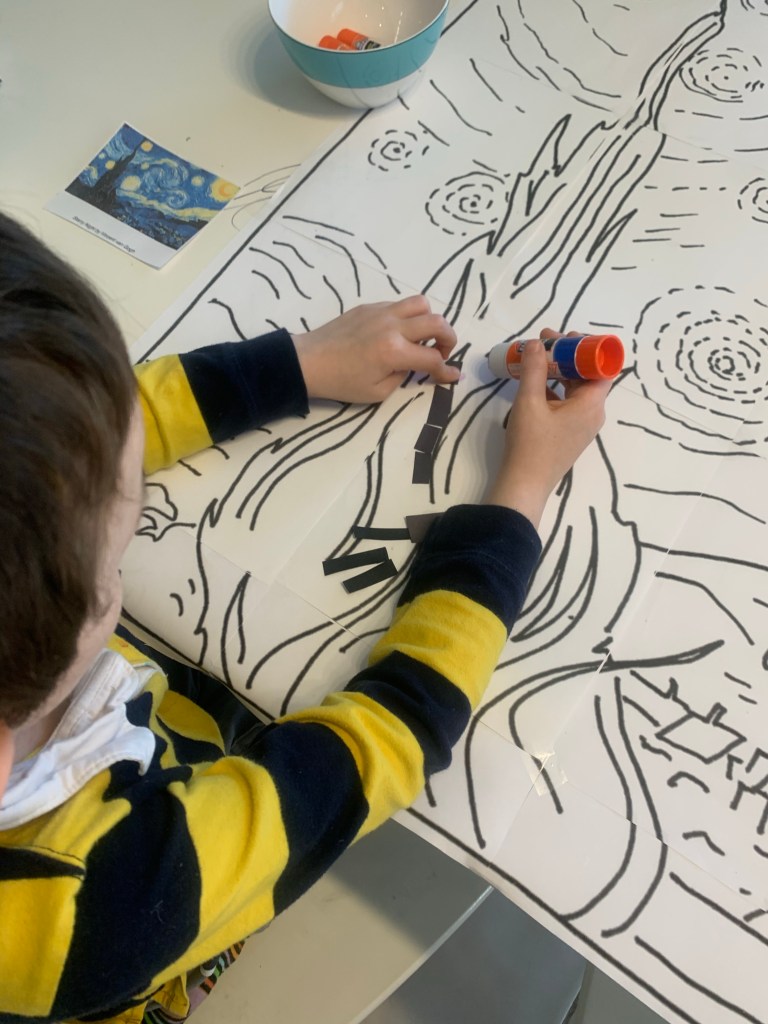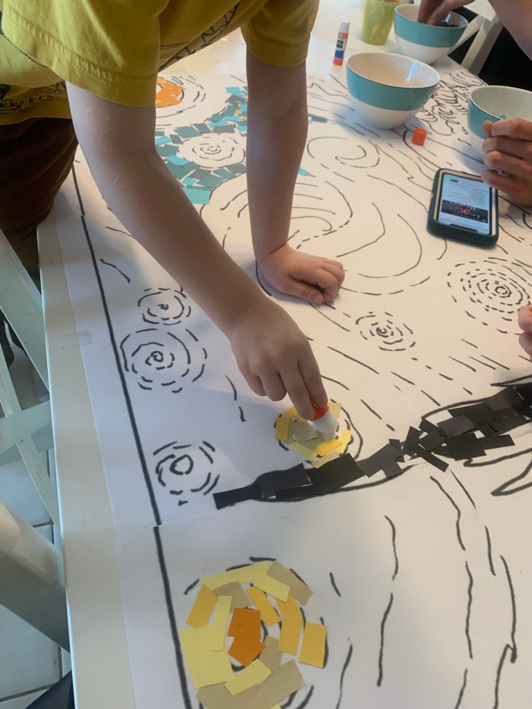 Whilst the kids were wolfing down some random smorgasbord lunch I’d haphazardly thrown together, I set up. I was going to do 7 bowls with 7 different colored paper pieces, but I eventually decided that I could do without the green. The actual painting doesn’t include it, the color by numbers most likely only did to add some interest and detail to the bottom right hand corner and detract from all the black. To make the mosaic pieces I cut paper into strips and then made a stack. Then I just randomly chopped along the stack, making varying sizes of piece. For the ‘Starry Night’ template I found an incredible sketch of the painting (linked below) and printed it at 400% scale on my regular home printer. It came out across 16 pages, and then it was just a question of putting them together like a puzzle. I also taped them to the table, because all of us working together would end up getting the pieces knocked, and my type A Teddy would most likely stop working once a piece was knocked out of place and was “ruined”.