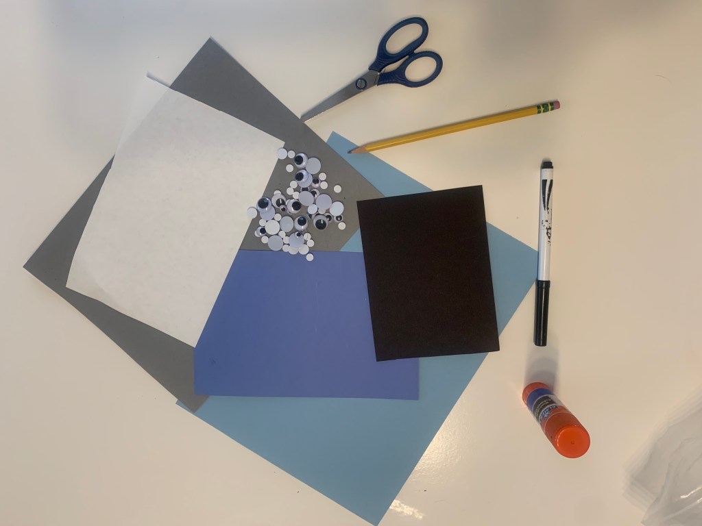 - Card stock or paper in two different shades of blue, white, black and gray.