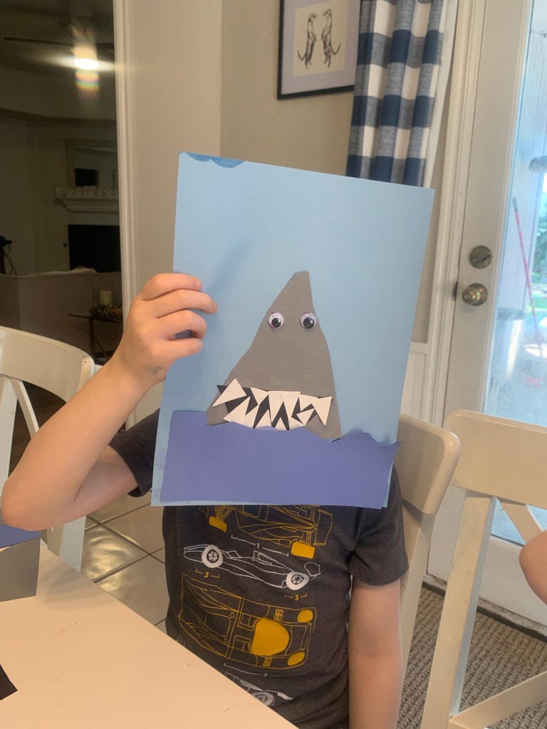 Today the craft was cute little cut and stick shark in the ocean. I’d originally seen the idea here, but had too adapt it slightly because even when we’re not in a pandemic, I don’t have spare newspaper lying around the house. I wish I did though, in my dream world I get the Times delivered every morning, and I read it, with coffee, alone. Then mull world events whilst eating a croissant or something. Instead I actually get my world news from alerts on my Apple Watch, which is too teeny to read properly, whilst picking Fritos off the floor that my children have scattered.