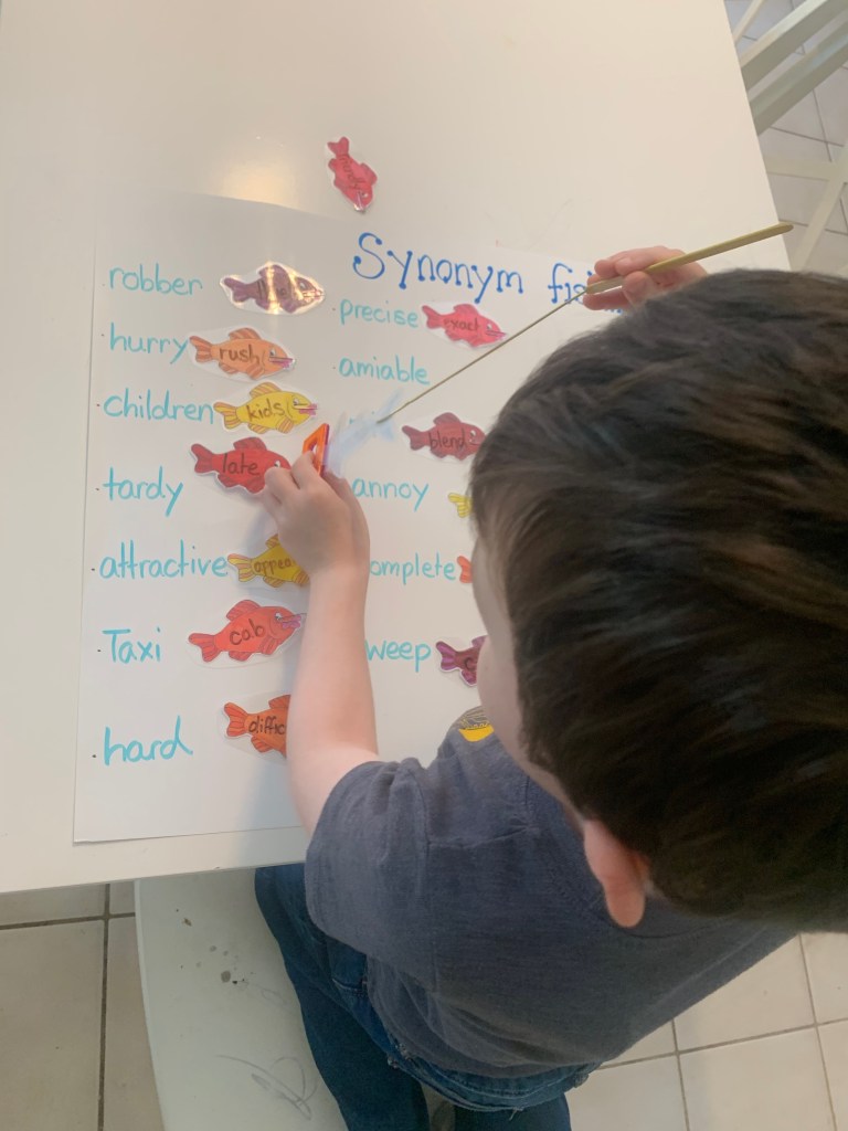 For William I made a synonym fishing activity. I took a large piece of paper and wrote 20 synonyms on it that I though he may not know off hand. I then used an expo marker to write their matching word onto the laminated fish. Because they are laminated they basically become reusable. Next time I want to use the fish I can just write something new on them. I displayed the fish around the edge of the paper, and Will used his magnet shark to fish the appropriate word out of the “ocean” and placed it next to its pair. It was a very successful activity. I loved the fishing element for the fine motor skill component.