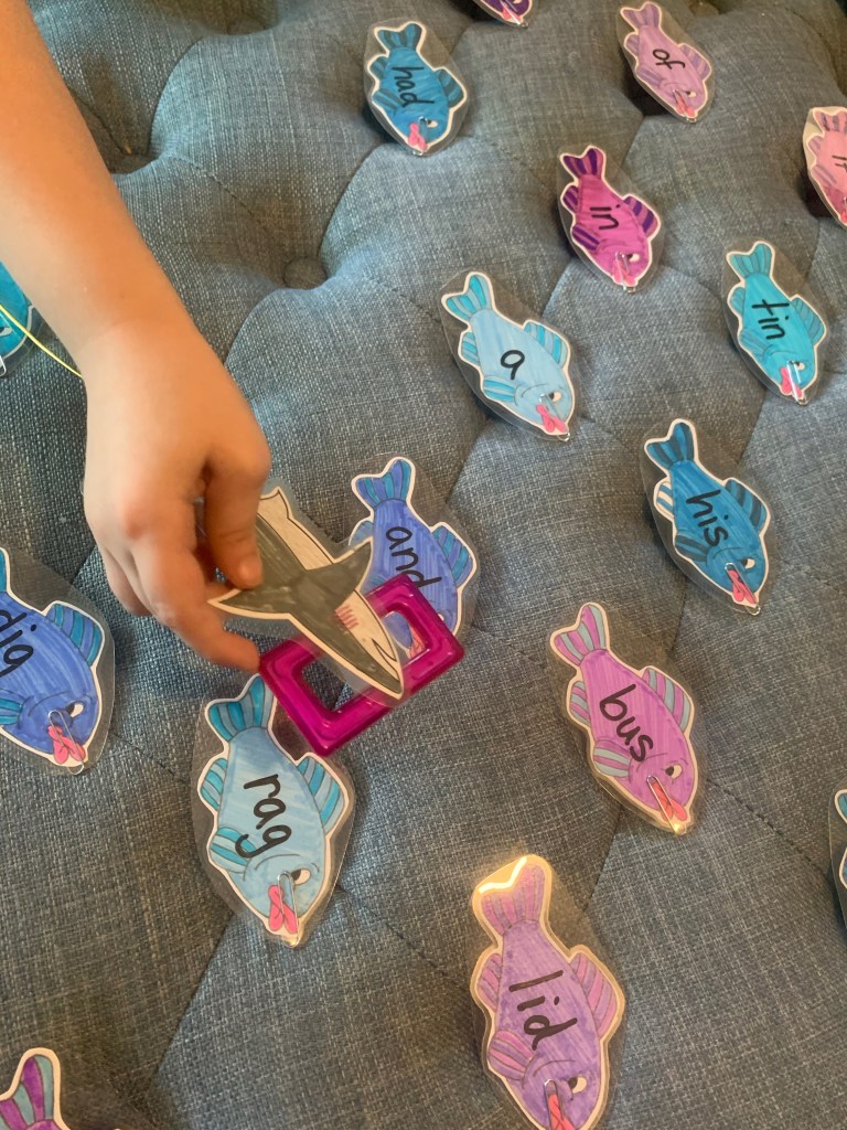 I set up two different activities for William and Teddy today for our learning time. I originally had had the idea of printing out tons of little sharks and having the boys fish for them, with some ELA component attached. HOWEVER: ever night after I read the the boys in bed William demands to hear the plan for the next day. I briefly mulled over what I was thinking. Said goodnight, went on my merry way to make a cup of tea, eat a sleeve of chips ahoy, and watch 90 day Fiancé. I was just settling down to. riveting hour of pure incredulousness that USCIS mad eye jump through hoops none of these people have to goo through, when I hear sobs. William is obviously in bed, in tears, because he loves sharks and simply cannot allow us to fish for paper ones. Apparently 100,000,000lbs of shark meat is harvested every year (his fact not mine, I should check on this) and we would be adding to the issue. Because I wanted to get back to scam brides and green cards I promised him we’d fish for something else.