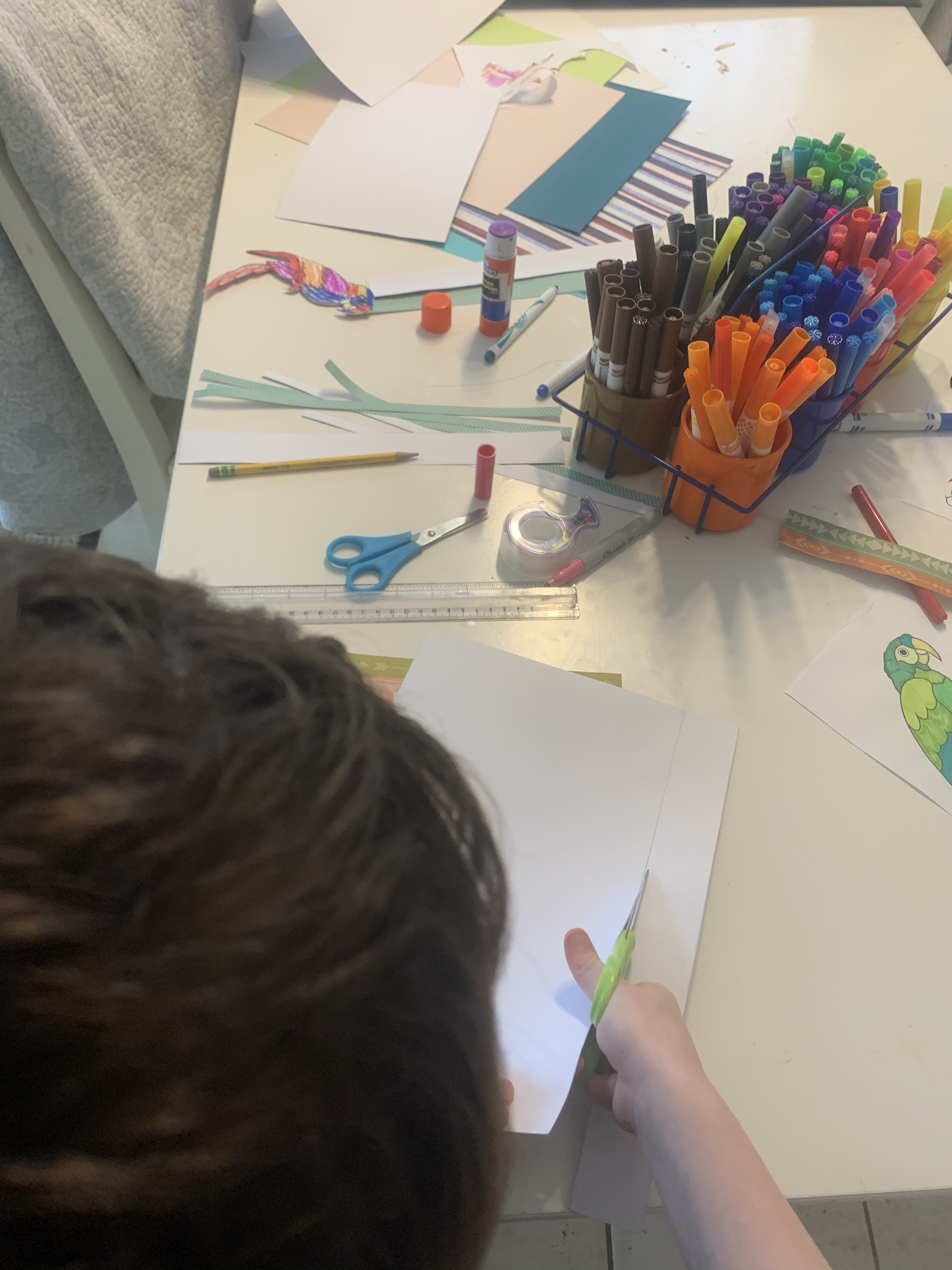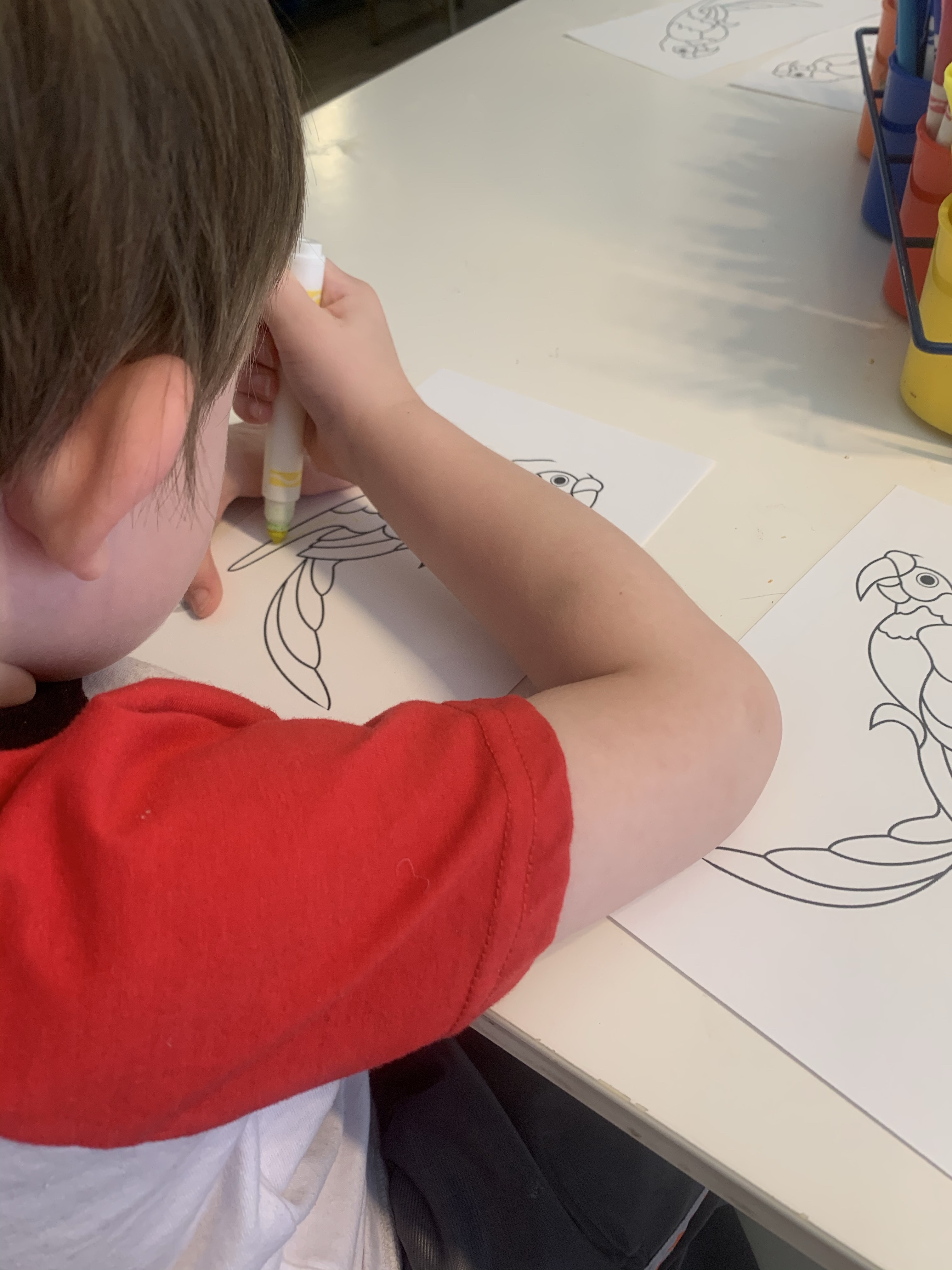 Teddy absolutely adored coloring his paper birds in today. He is still very deeply entrenched in his anal neat stage (maybe this isn’t a stage!! Maybe we finally have a neat Truffles!) which means that coloring two 4×6 paper birds took him a considerable amount of time. He chatted to us, and his birds whilst he colored though, and muttered a lot under his breath about how he wanted to go to pre K. Soon little boy. Soon! He also insisted on putting his own split pin into the little holes I had cut with the scissors. He loves tiny tasks, and it’s becoming increasingly obvious that it won’t be too long until the line of craft attainment and age is no longer linear around here.