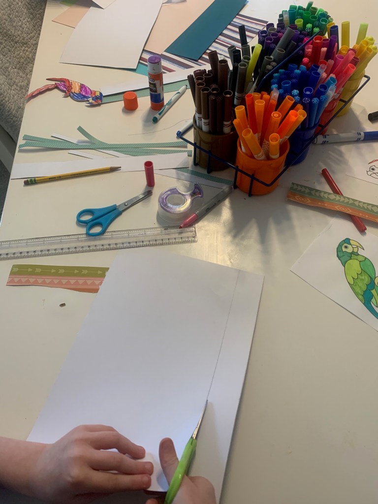 Todays craft was cute. We made birds in cages out of paper. There were a couple of parts that the boys struggled with, and some tips I learned a long the way that I would absolutely do if we ever do this again. Most importantly: I honest belief tape is just SO much more versatile and useful when crafting with kids than glue. I know we have hella time until Christmas rolls round again, but lets all try and remember that on Dec 26th Walmart is literally full of tubs of scotch tape of clearance. Stock of friends!