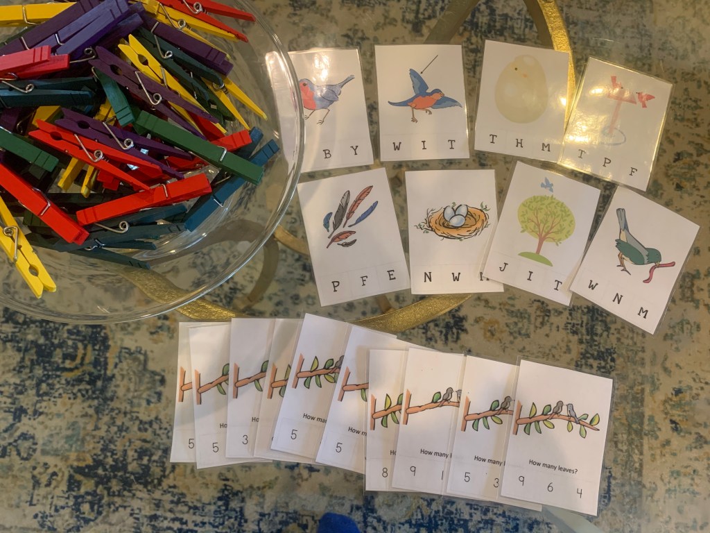 I really love clothes pin activities for any age. I think everyone can do with the fine motor skills they help with, and the convenience of being able to pull the pins off afterwards, and have the cards be used again and again is magic. Love a sustainable resource. That’s a wrap for today’s dip into the world of birds. I think this week is going to be our 3rd week in a row with only 4 days of activities. This evening we got a very exciting package delivered from my parents in law, and I have a feeling tomorrow it is going to be almost impossible to get the boys to concentrate on school work. William has online school until 12, and then the afternoon will be filled with playing with the spoils from Grandma. I’ll catch you all on Wednesday. I’m dreaming up some kind of egg nest activity, see you then!