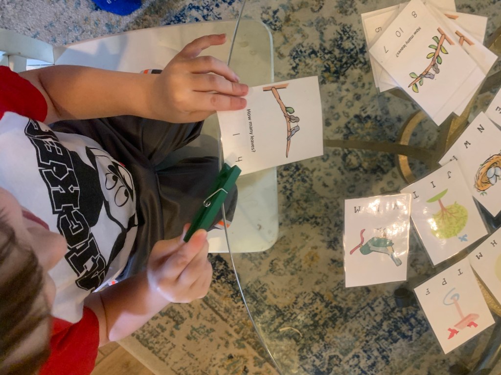 For Teddy’s activity we fell back on a classic clothes pin activity. Whilst I was online looking for resources for the week I found an absolute treasure trove of printables (linked them below). This pdf has pages of activities for a pre k-k student. I chose to print the card sets where you had to choose the beginning sound in one set, and count the leaves in the other. They were cute. Teddy had to talk through the pictures for the beginning sounds with me, as it wasn’t immediately clear, so just a heads up that for the younger crowd this isn’t a set and leave activity. They’ll need a little help.