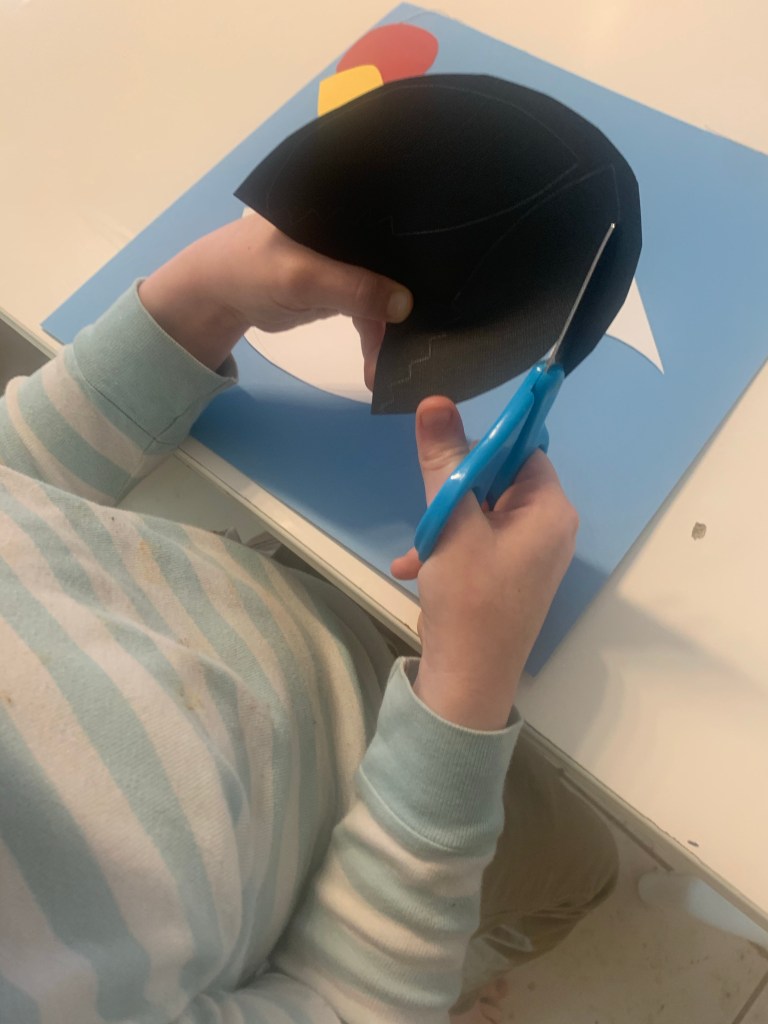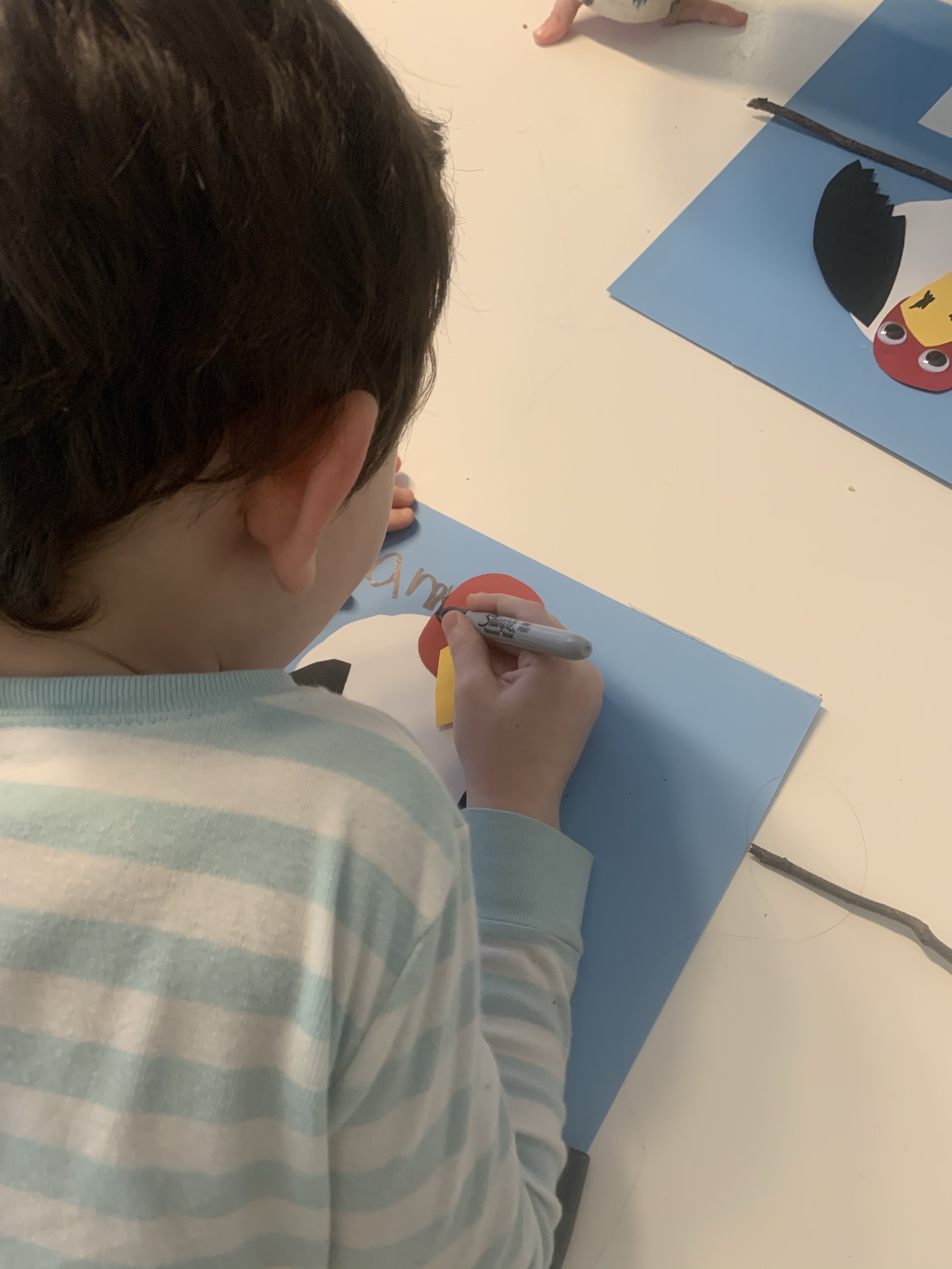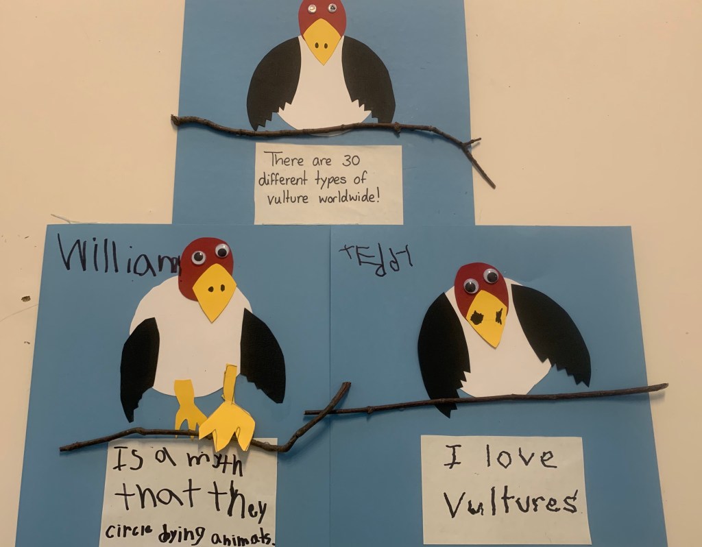 I adapted the activity level for both William and Teddy. For William I had the individual parts of the vulture drawn on the card, and he cut them all out himself. For Teddy I had cut out the wings, beak and face, and Teddy was only responsible for cutting out the white circle for the body. He was a LOT more successful and speedy than I thought he would be, so next time I’ll definitely give him a little more to cut out. I had already glued a rectangle onto each blue backing piece of paper. This was for the kids to write their untrue facts when we were done. I then let them glue their own pieces together on the paper, draw their nostrils on, and glue on their google-y eyes. William actually asked me if they had to have two eyes, or if they could choose as many as they liked (Teddy’s 7 eyed shark has left a long lasting imprint on us all!) and I said I wanted 2. Yes I know I know. I’m stifling their creativity. Honestly it’ll be a super thing for them to bring up to their therapist in 20 years, today, I was putting my foot down.