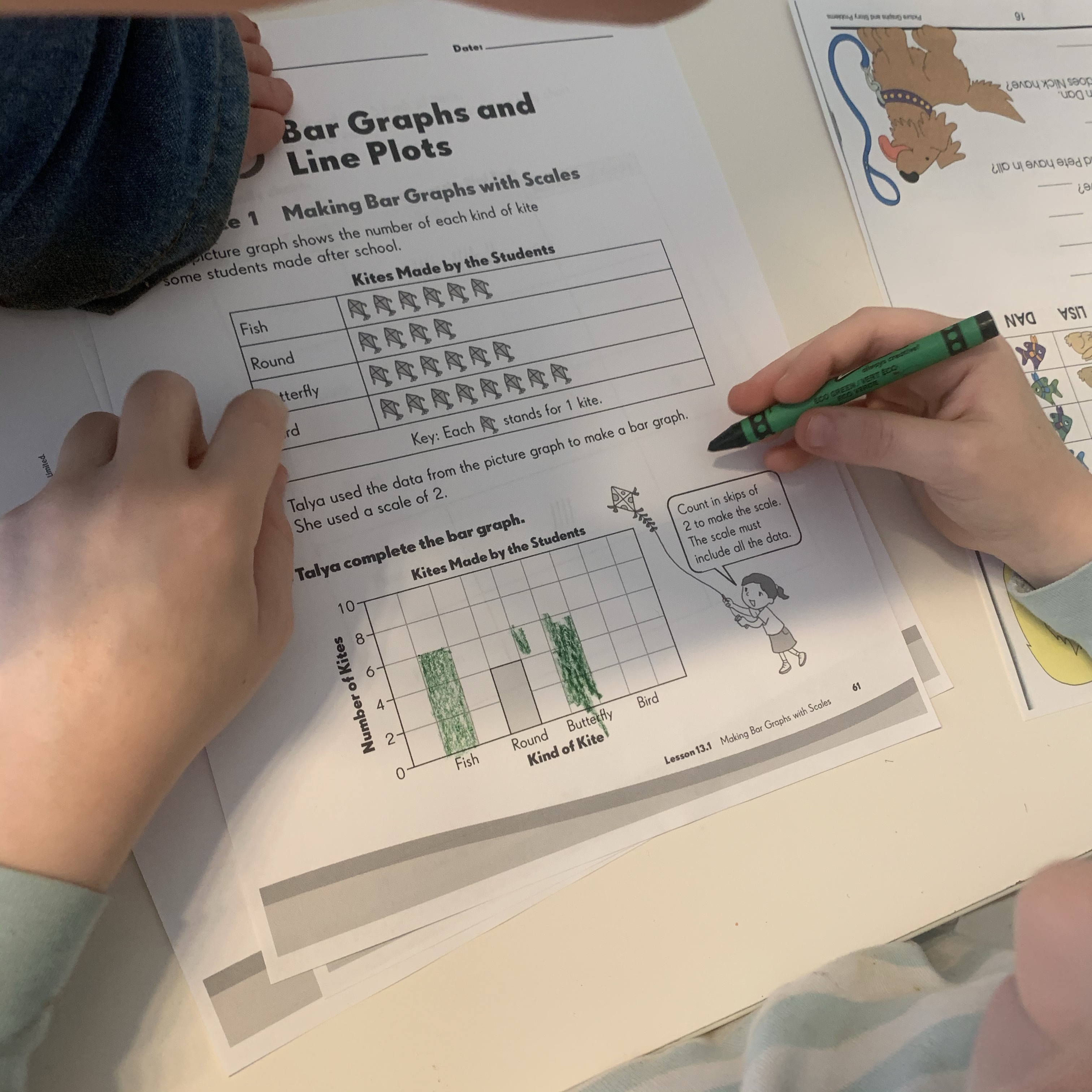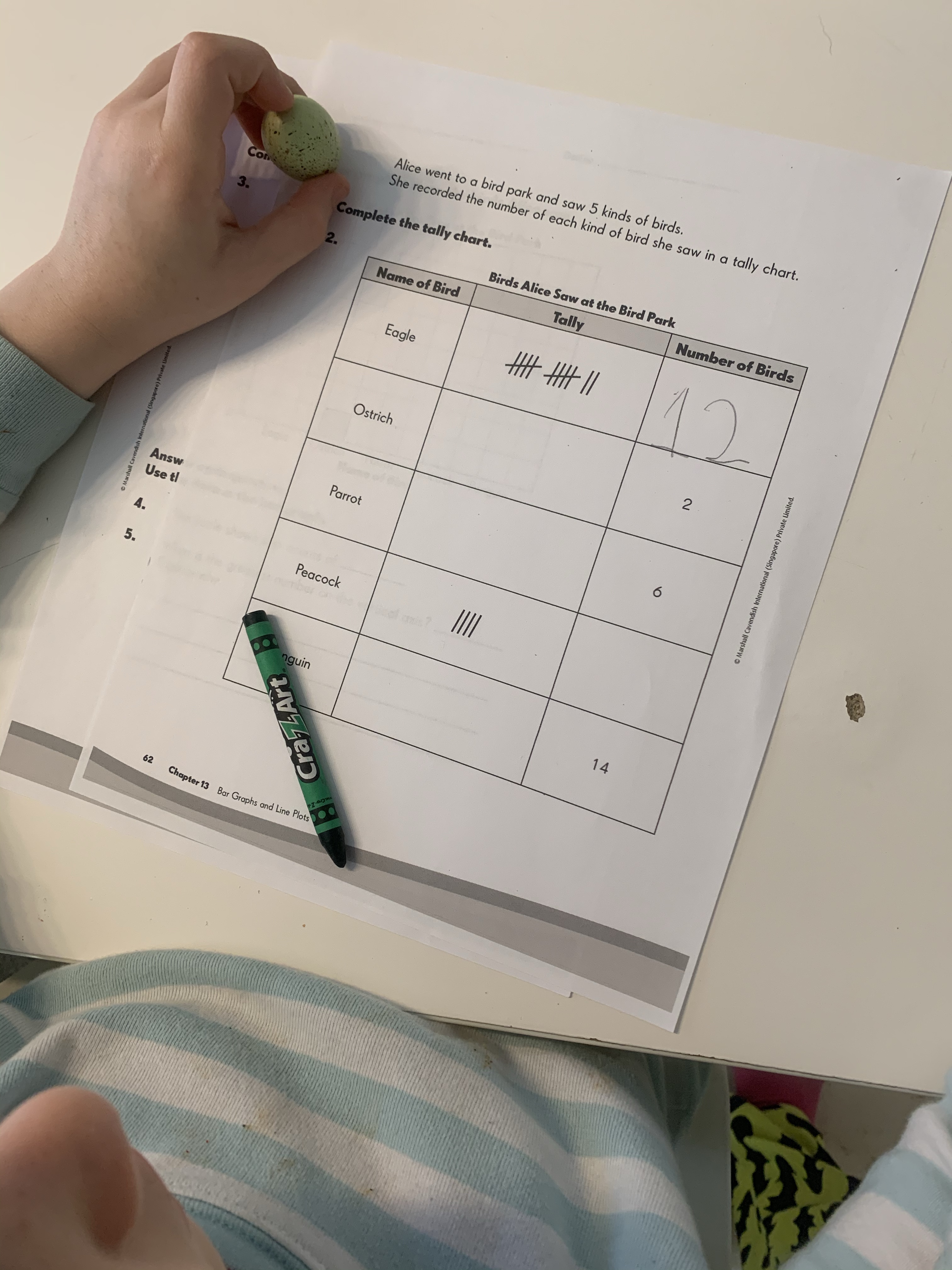 William is currently working on bar graphs and tally marks for math. He works very well individually, but tends to rush to join us if he thinks Teddy is doing something more entertaining. Luckily he decided counting out the eggs onto nests was beneath him, so he focused very carefully on his bar graphs. His confidence is quite high now with his math, he’s finding it very manageable, so I think I’m going to try introducing some new topics in the next few weeks. 90% of what I cover with him are recaps of things he has already learned. To keep him engaged this summer I’m going to change that, and actually sit down and do some mini lessons. Or maybe I’ll tell myself I’m going to do that, and actually just parent with Disney + during June. The jury is still out on which direction this is all going to take! Perhaps we should be taking bets on how long I can keep up educating before I just let them run around the yard covered in dirt for the rest of the summer.