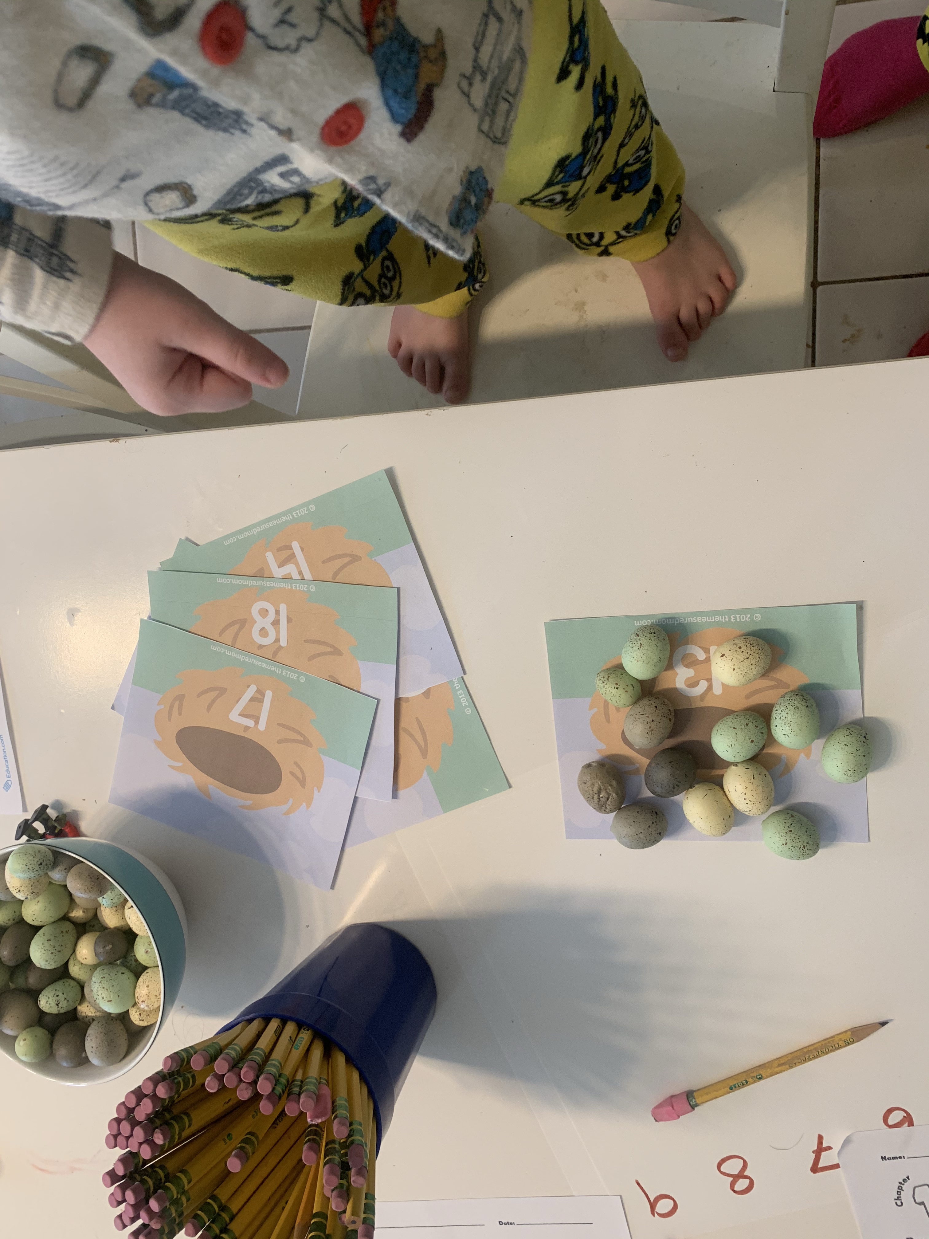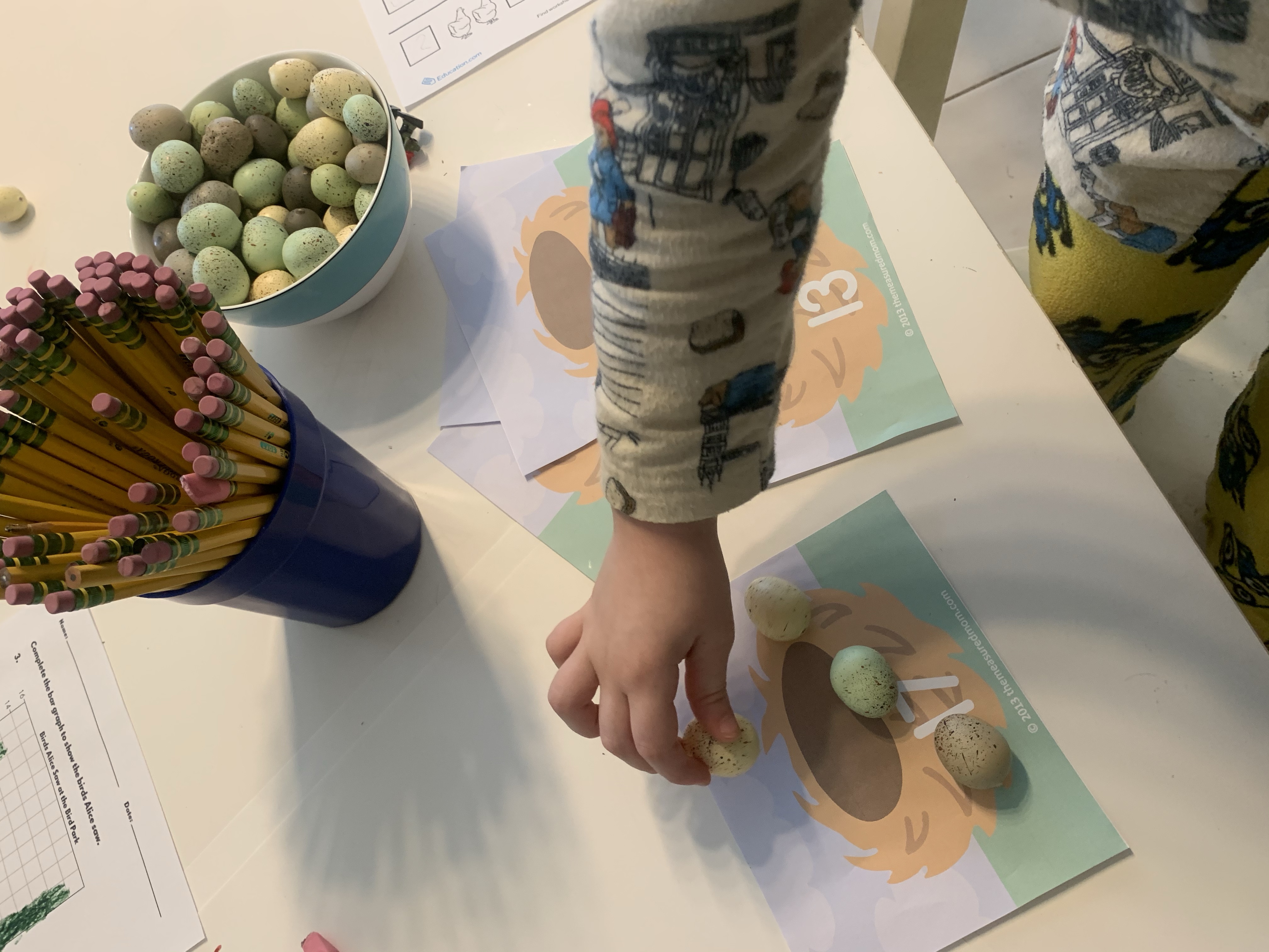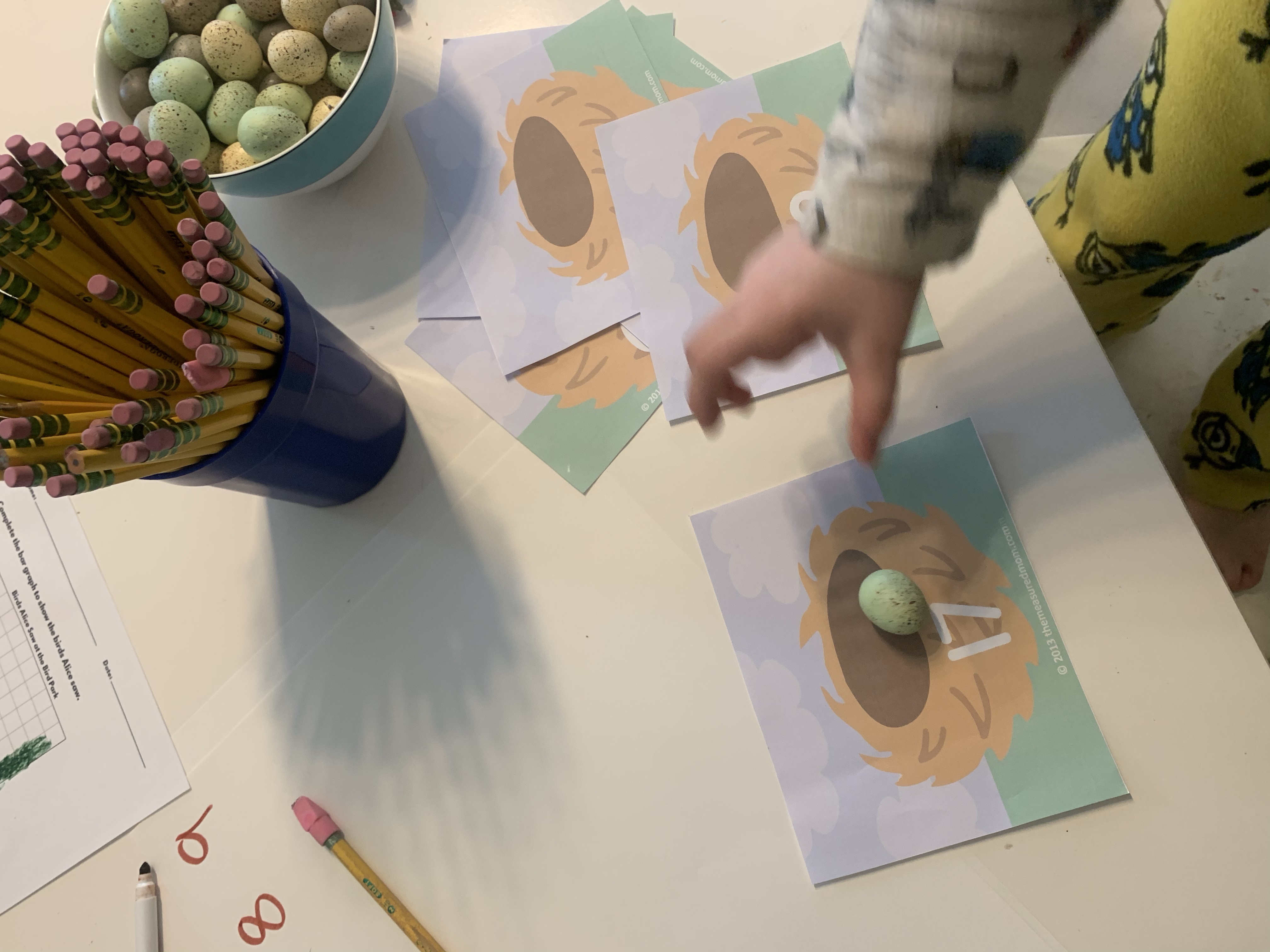 Once he was done with his chicken counting I gave him some nests I had printed with different numbers on them. Luckily for Teddy it’s mid May and I’ve still not cleared away the Easter stuff. So I gave him a bowl of faux speckled eggs and let him count out however many each nest needed.