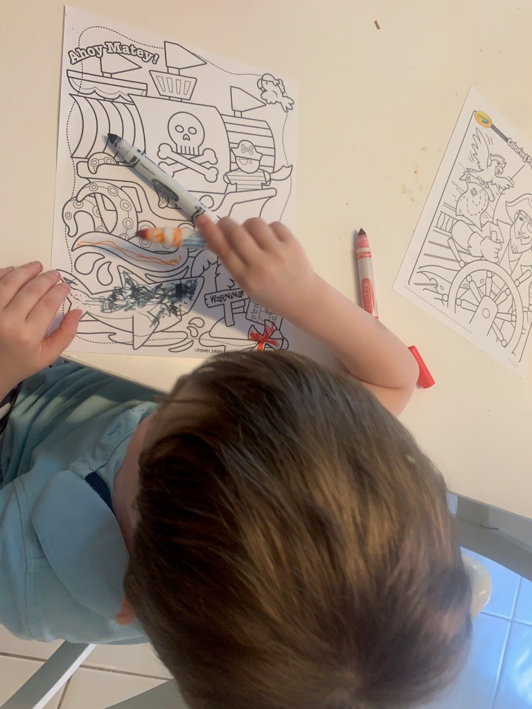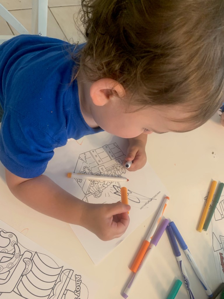 90% because I was semi forced into this theme and didn’t have anything properly planned, and 10% because every one loves a coloring opportunity: we started the week in the VERY easiest way with basic coloring sheets. I’ll link a couple below, but there are probably 9,006,243,423 online. Just google “pirate printable coloring free” and you’ll get a zillion.