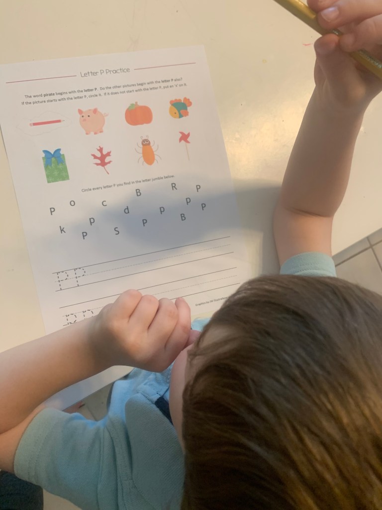 Teddy busied himself with some excellent counting and labelling of groups of pirate themed items. His pencil grip is completely wrong, and I’m struggling to get him to adjust it, (all suggestions sent my way please!) but his forming of numbers in particular is coming along really well. It’s going to be so interesting to see how he does at Pre K/reception this fall. From what I can see so far he is by far my most academically able child, however he is definitely my least hard working…. He also did a matching activity and some filling in blanks with the missing sound. He’s definitely much more into the math than the reading at the moment, long may it last. we need one solid mathematician in the group.