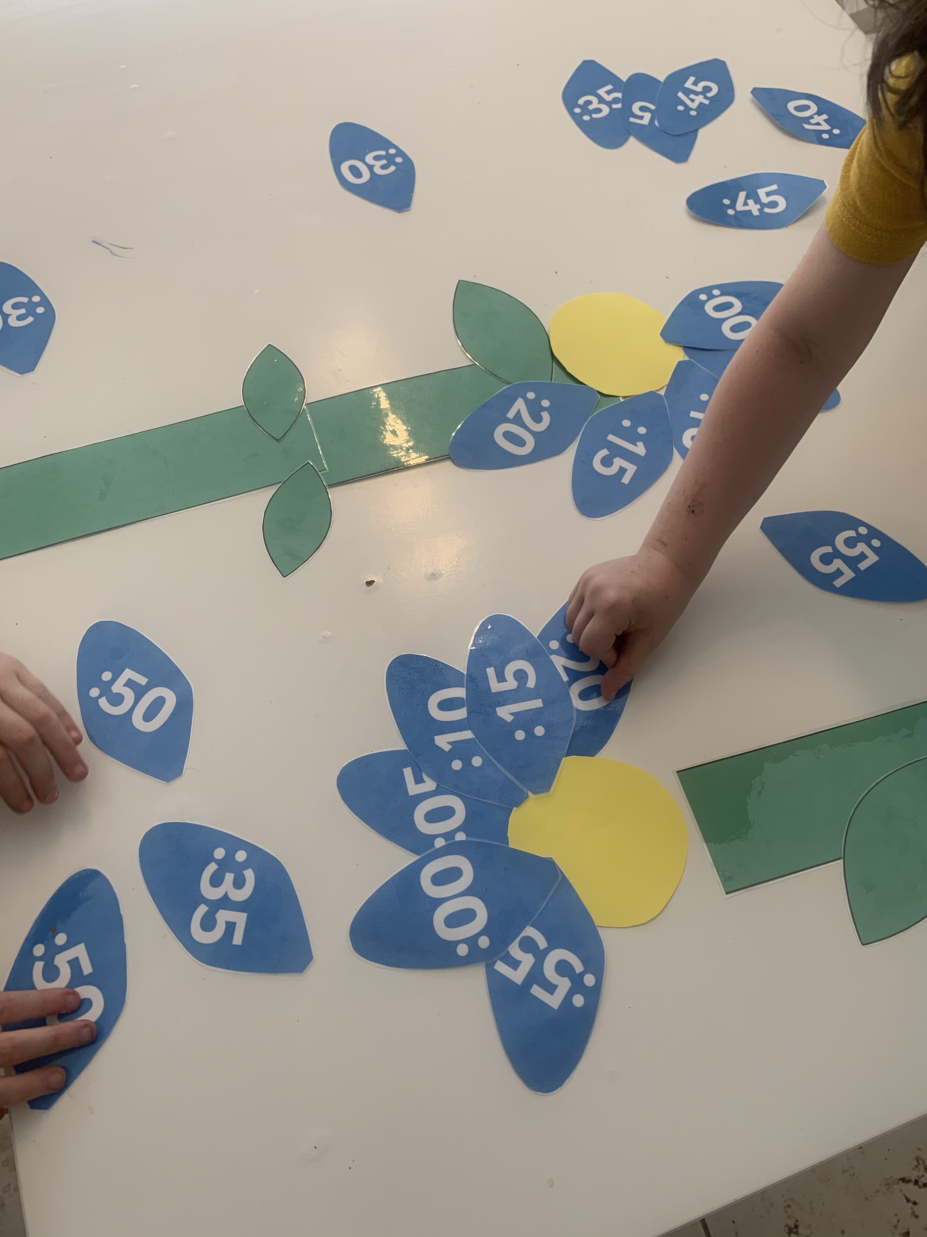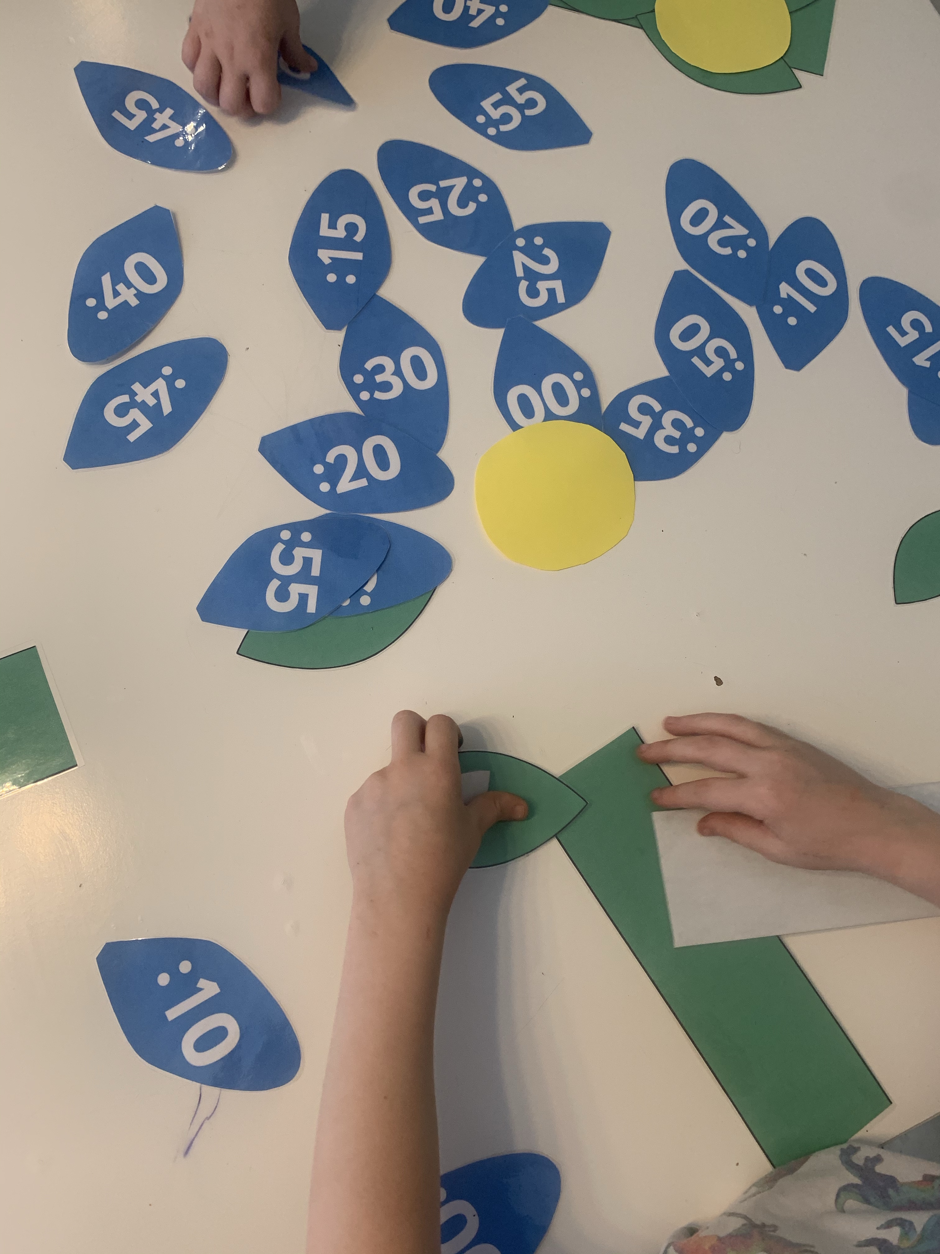 As this is an educational activity I’m desperately trying to pass off as a craft I don’t have a cute little picture of supplies you’ll need. I don’t think you can actually make a printer and a laminator look attractive in a photo anyway…. I do however have this little collection of the kids using the petals to fill in their clocks.