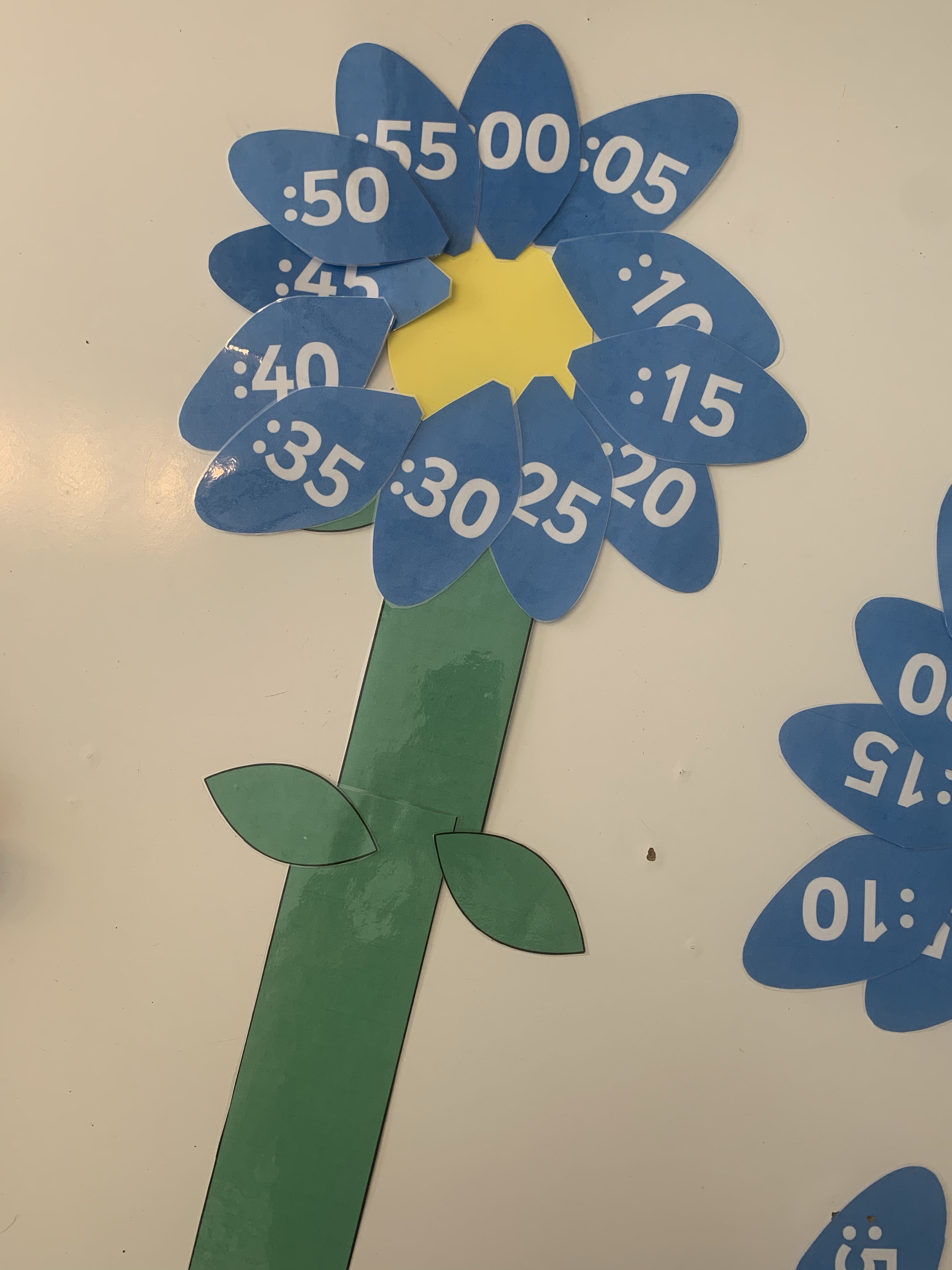 My friend Aimée suggested that we use flowers to learn telling the time, I’m pretty sure I mentioned that yesterday. (Either that or I’m having a serious deja vu.) Anyhoo. Armed with my professional advice I headed to twinkl and found this lovely printable that shows kids how the minute hands on clocks count time. I printed two, cut out all the petals late at night in bed whilst watching law and order, and laminated them.