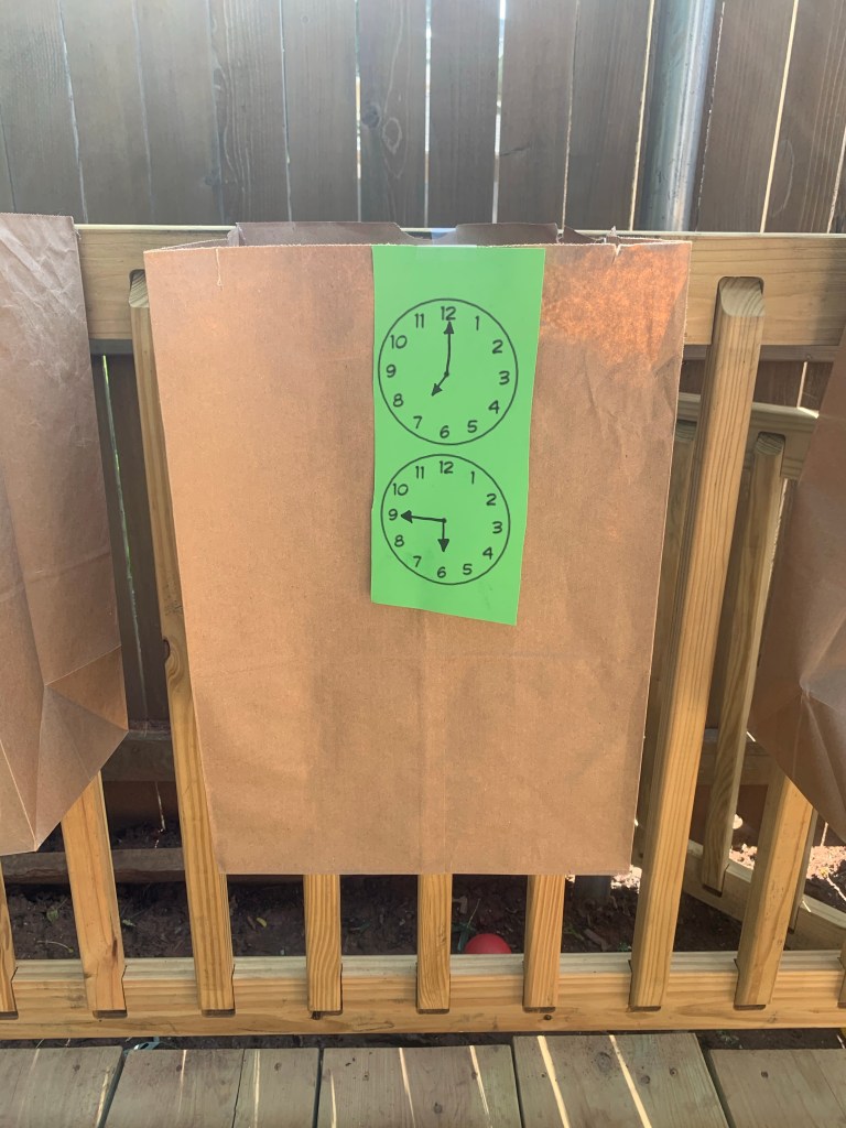 Onto our actual formal educational activity of the day: sorting times into groups. I can’t link to this activity somewhere on the internet, because I just invented it out of desperation for some quiet time. Here’s how it works: I taped some paper grocery bags around the edge of the deck, and stuck a couple of clock templates on the front of each one.