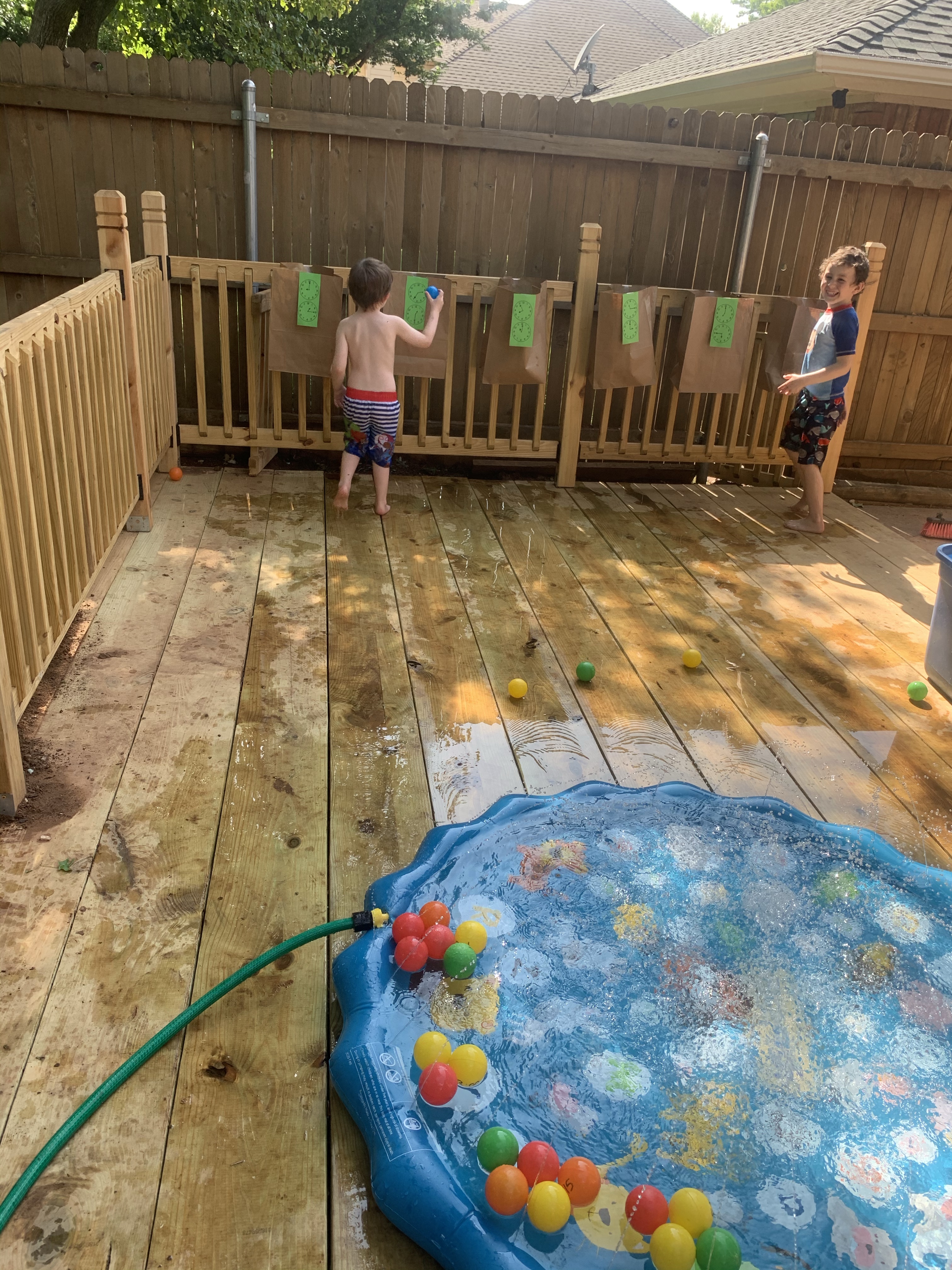 Then I filled up our fabulous splash pad with water and grabbed a ton of the balls we have lying around the garage. Using a dry erase marker I wrote digital times on all the balls and threw them in the water on the splash pad. I then released the boys onto the deck in their swimmers. Their challenge was to jump into the splash pad, grab a ball, read the time and drop it in the paper bag with the matching clock. Whilst they were screaming, and splashing, and sorting, I lay on the sofa outside, staring at the sky, fantasizing about having a live in nanny, and wondering if it would be weird to hire a sitter just go I could go and stand on the corner of my block and scream into the abyss.