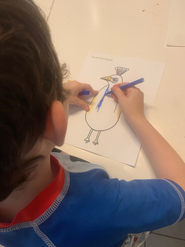 To start I printed us each one of these peacock templates (linked below) then whilst the boys colored them in, I drew around one on some card and did a basic peacock feather shape around it. I cut these out to save a little time later. The boys chatted away as they colored. Teddy as usual chose every shade of blue we had in the house, and as usual, his peacock was a bad guy who had the only life goal of defeating William’s peacock. He’s a creature of habit. Once they were done coloring I let them cut out their own peacocks. There definitely getting much better with the craft scissors. All this practice is paying off. Cant wait for their scissor art scholarships to Yale in 2033.