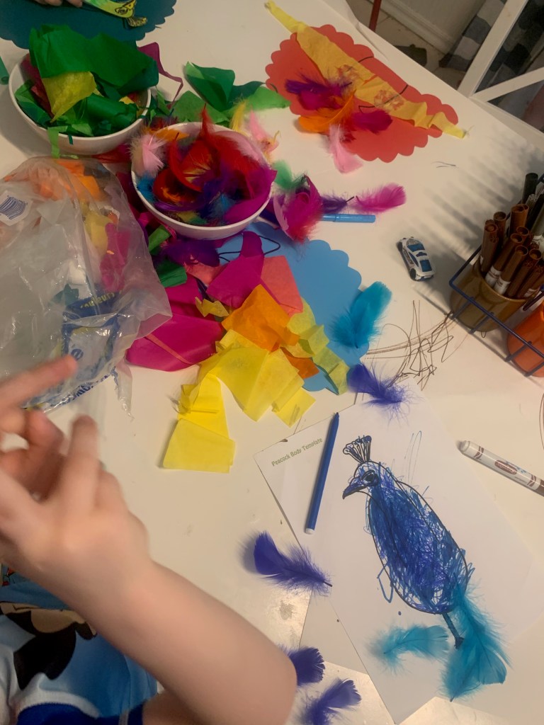 It is a seriously weird mix bag of craft and learning activity today pals. Craft wise, I recently fell down an amazon worm hole and ordered a large amount of stuff I really didn’t actually need. I spent the first 6 weeks of the pandemic afraid to buy anything online because I didn’t want to be responsible for a delivery driver having to be out of his house. However now that Oklahoma is nearly at phase 3 of reopening, I felt I could go a little crazy and get myself some pointless crap, including a bag of colored craft feathers. I have a garage FULL of craft supplies. The Lorax would sob at the amount of paper I’ve hoarded. However, we didn’t have any feathers, and this is bird week, and I’m paying for prime, so here we are. But what to do with $3.99 worth of feathers? Trusty google to the rescue! Peacocks.