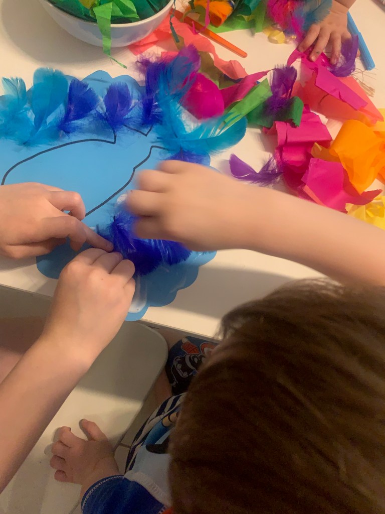 Arth had been coloring with us up until this point, however even I, with my poor grasp on what will get a toddler ridiculously dirty, knew that he had to be removed for the next stage. I poured some Elmers glue out and the boys spread it over the card. Then they started sticking on their feathers. It was actually very comical watching them stick the feathers on. Teddy loves to be precise, but even as an adult, a dollop of craft glue and a bag of cheap feathers is a recipe for stress. He dealt with it better than I thought. That is until he was too busy chatting to William, and accidentally stuck a purple feather on his entirely blue picture. He completely lost his cool, and it took a while to calm him down, even though it only took 0.3 seconds for me to remove the actual feather. Just as we were starting to finish up Arth decided he was done with his Vtechs on the floor and climbed onto the table and into some glue. It’s moments like that that make me wonder why I don’t always just strap him into his highchair…. three children in, and still making beginner mistakes.