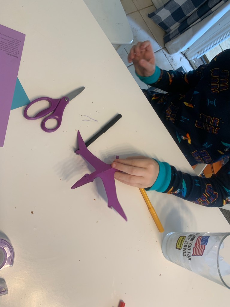 Anyhoo, once our pterodactyls were all decorated I used scissors to cut out the two marks where the string goes. I have mentioned it in a previous blog, but I really need to find my hole punch. There have been an increasing number of days recently that I’ve needed it. You don’t need a hole punch for years, then suddenly a global pandemic comes along and you need it all the time. The worst.