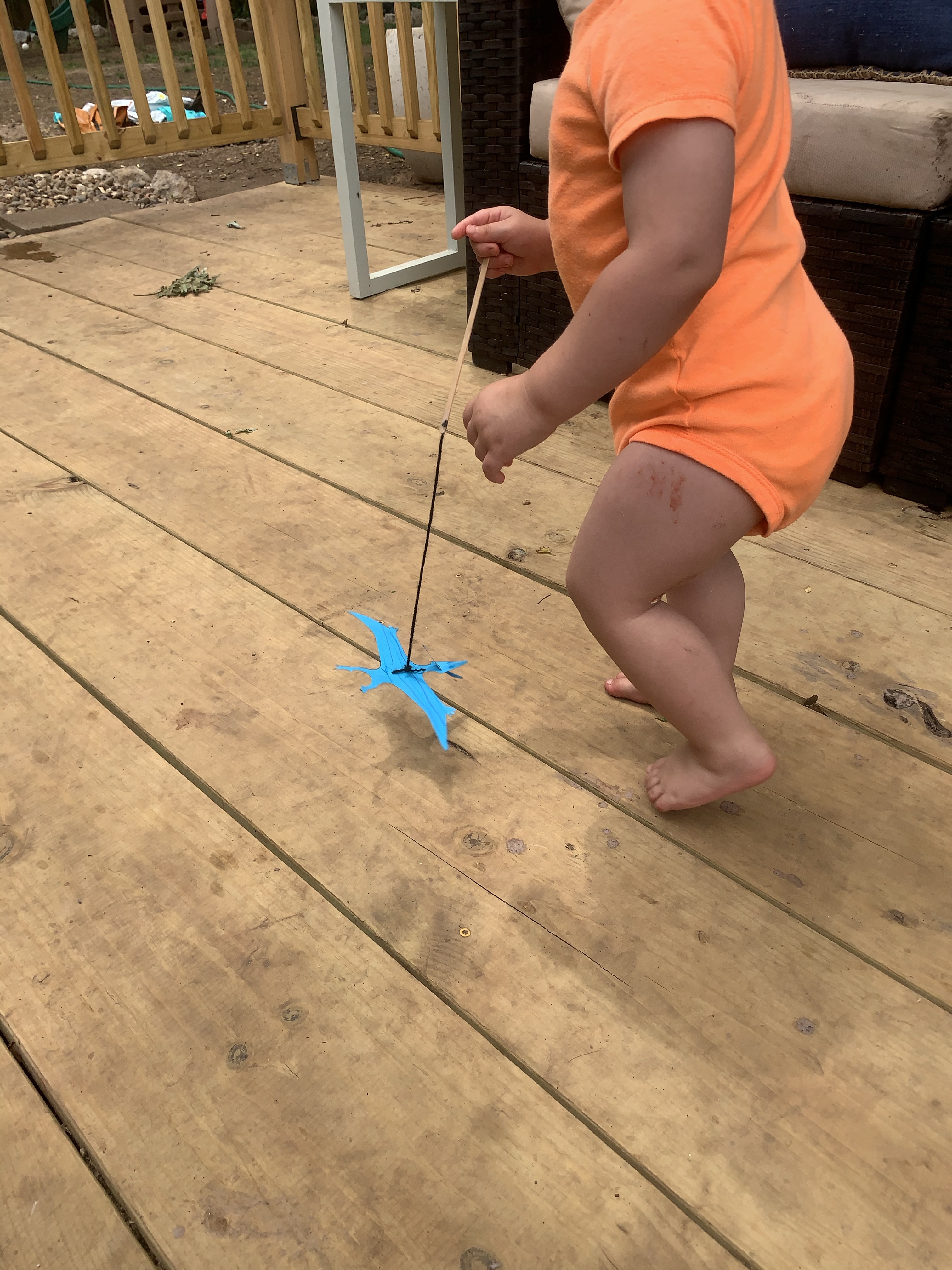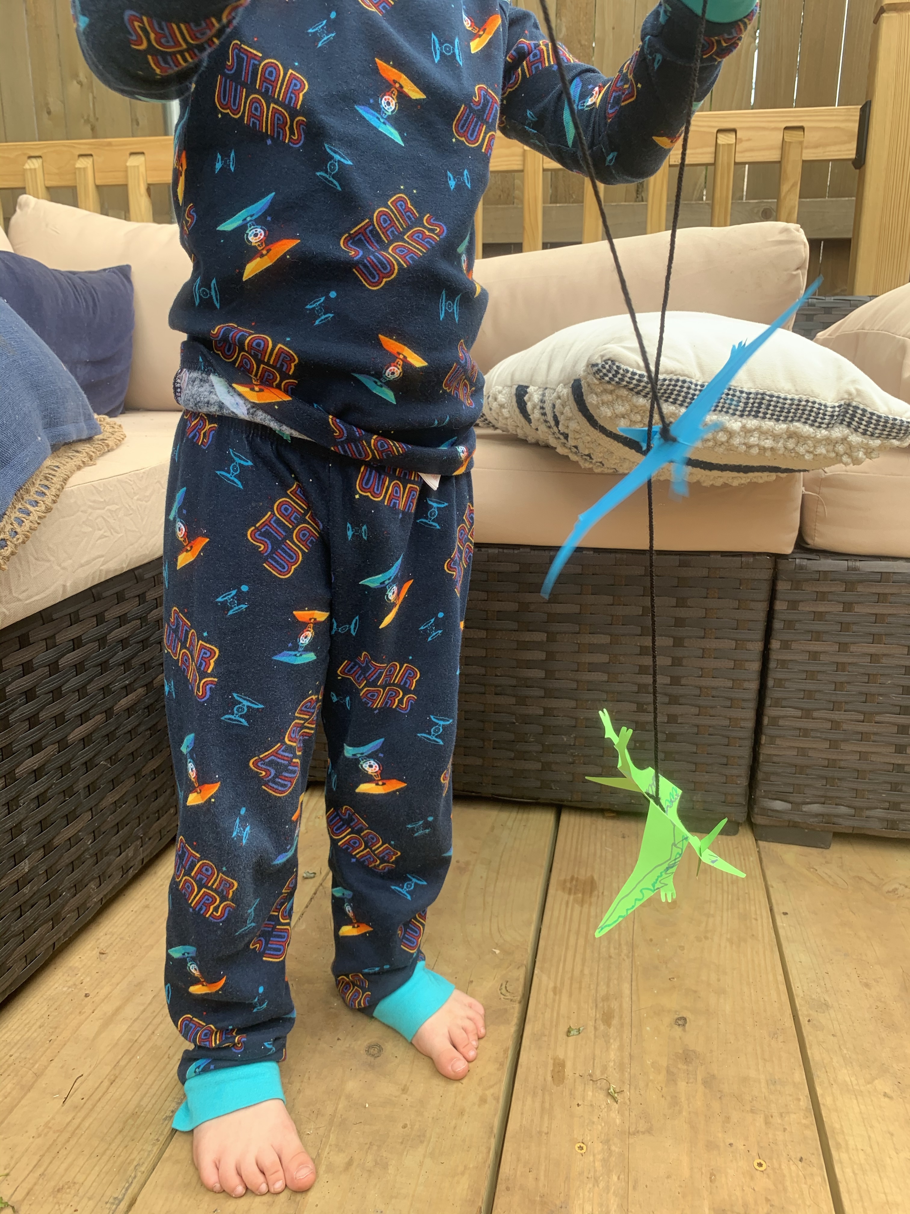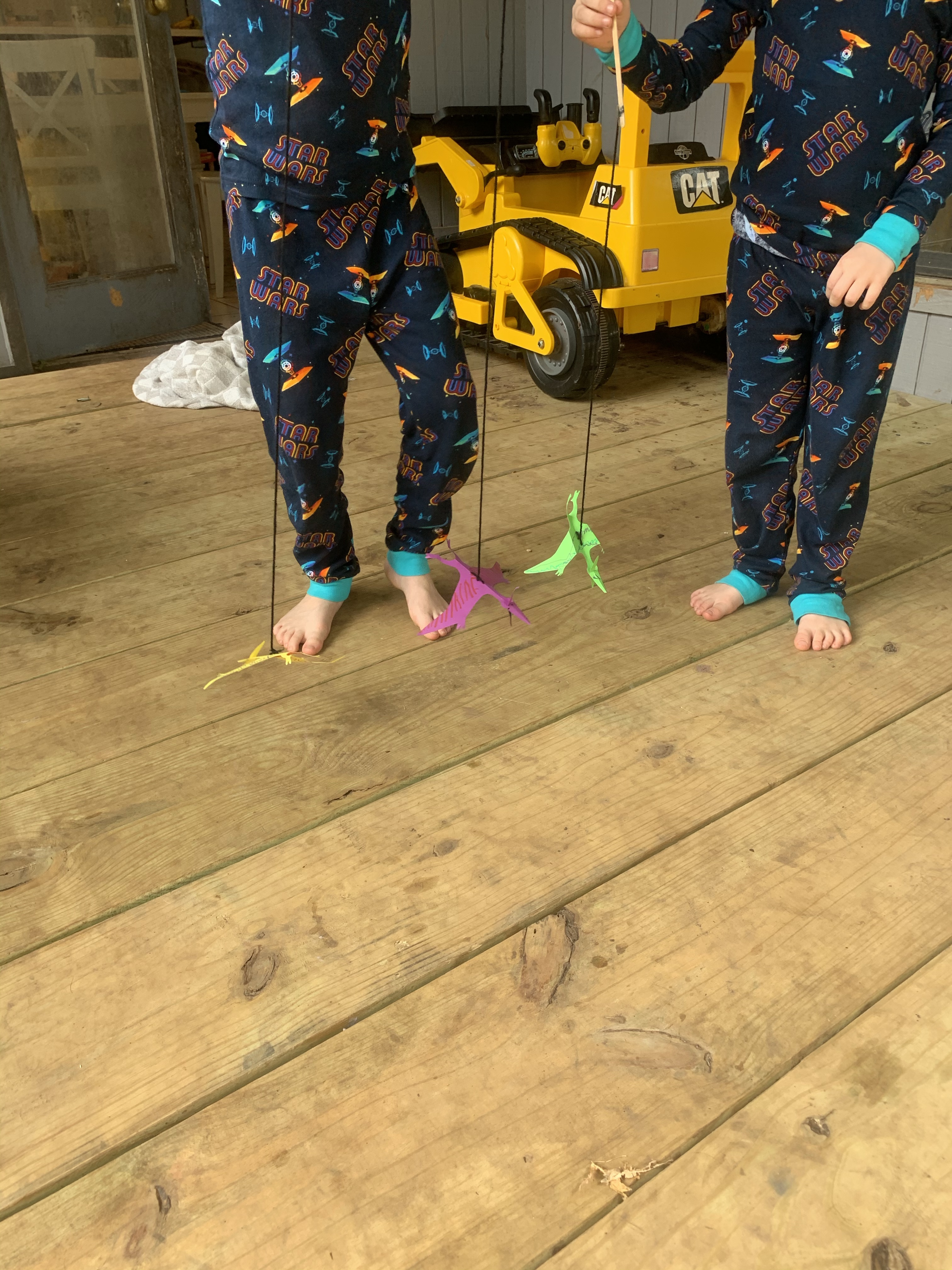 After all the hard work was done we took them out for a spin! The boys had made two each, but of course the minute Arthie saw them with them he demanded he hold one. Teddy generously handed one over and we headed out to the deck (yes, still in our pajamas) to play. The boys gave their pteros silly names, and spent a surprisingly long time wiggling their sticks to make them fly around the place.