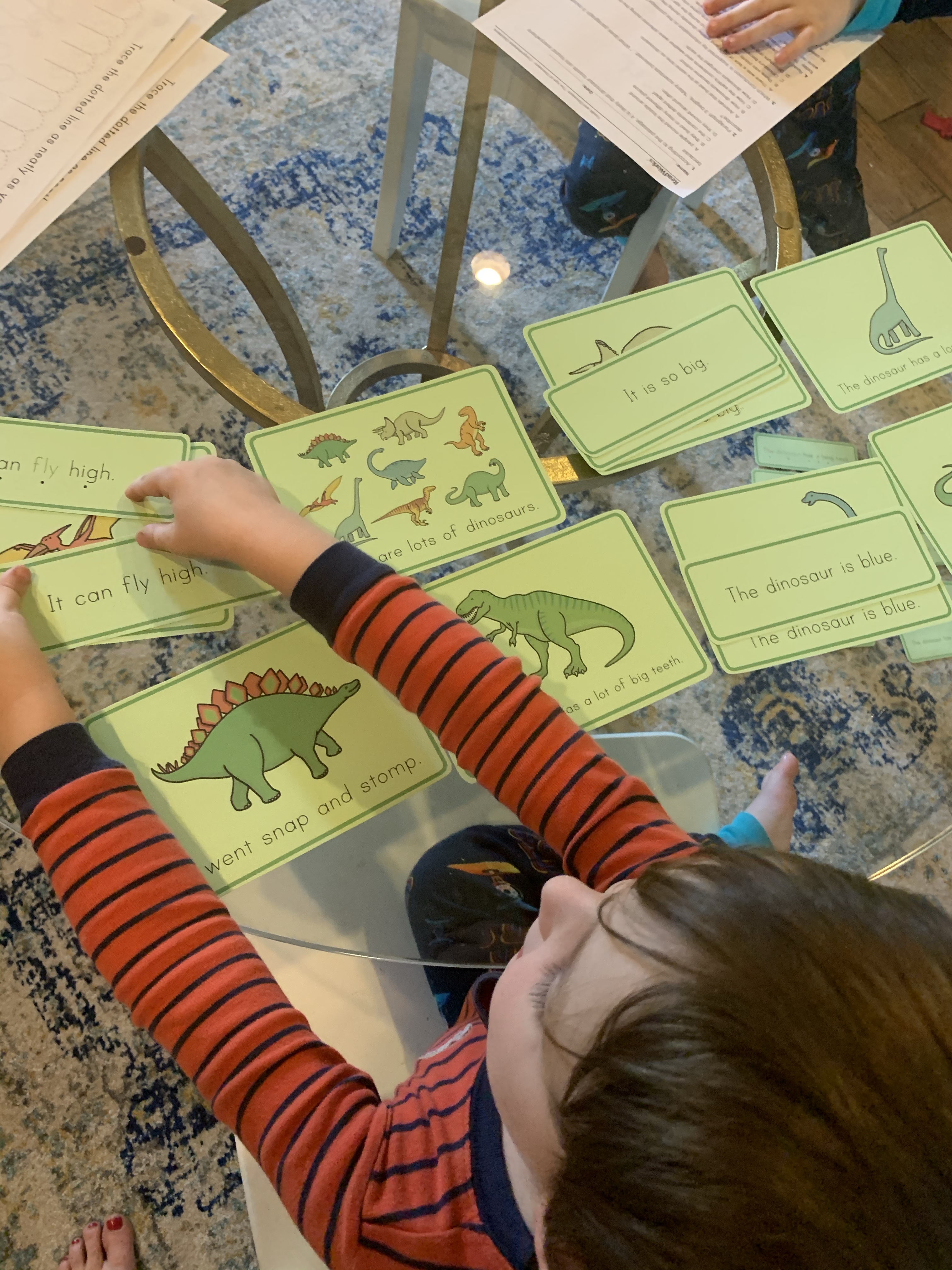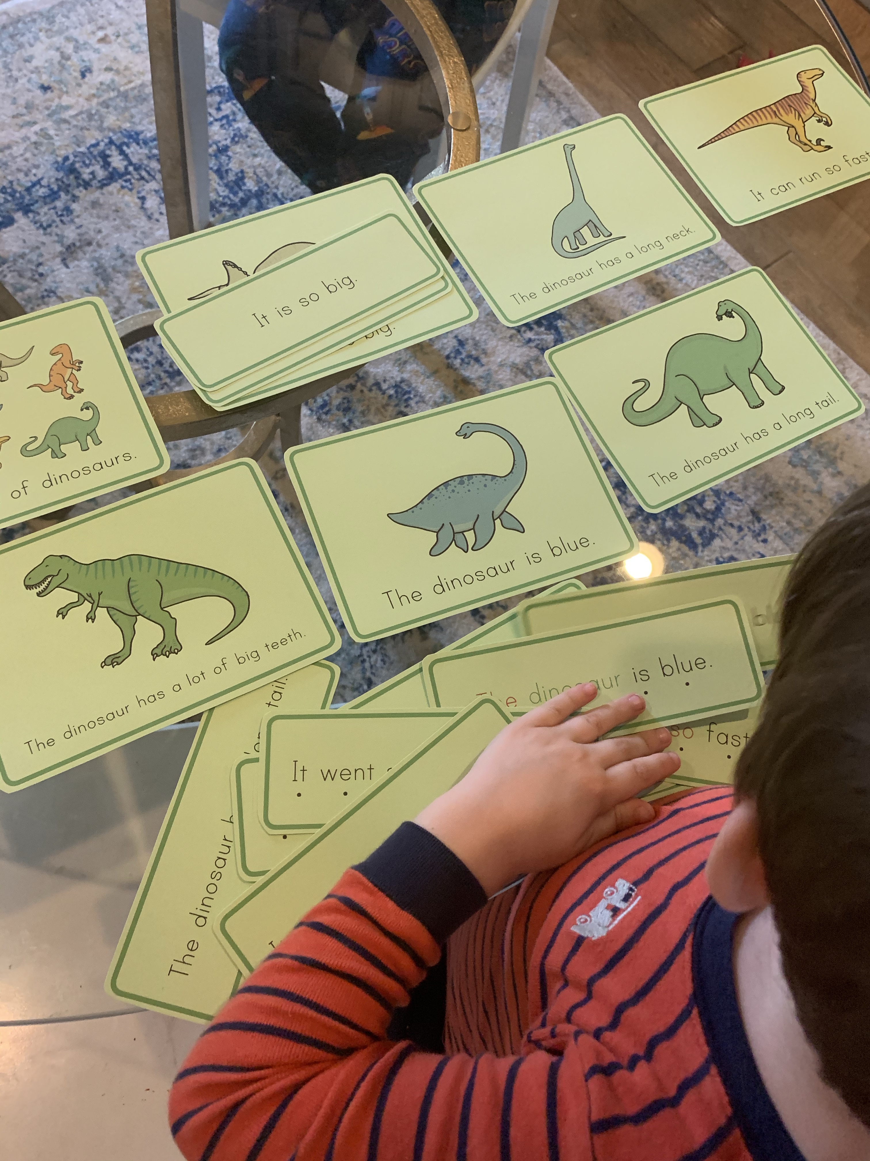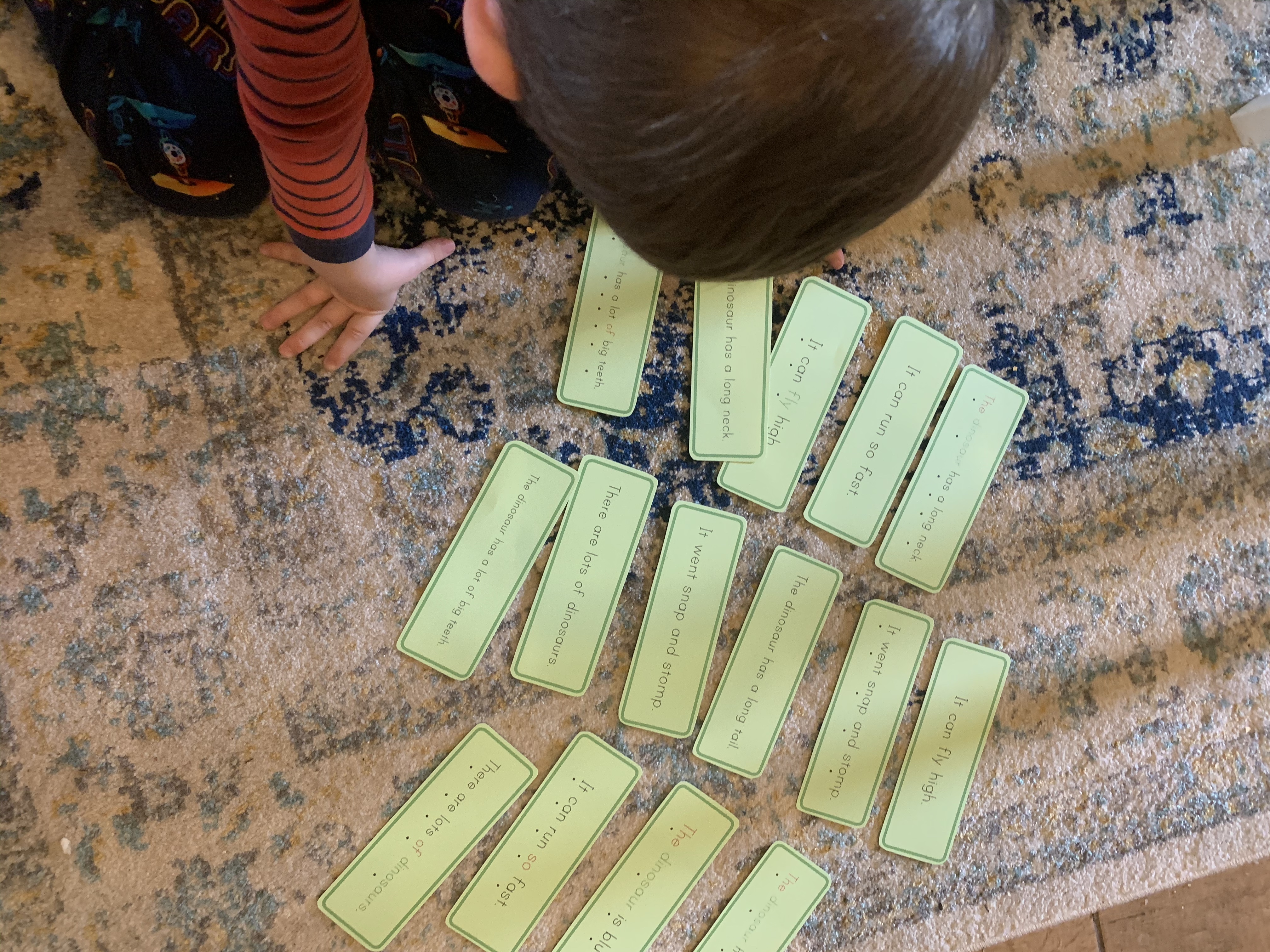For our academic portion we kept it nice and simple today. Teddy has some awesome sight word cards from Twinkl that I printed out onto green card. Each sentence had three copies, one with a picture. I laid them all out on the table (then eventually the floor and the table as he needed space). He chose one with a picture and we sounded out the sentence together. He then took it to the pile on the floor and tried to find the two matching sentences. It wasn’t a very complicated activity, but he always gets so very excited when he sounds out a word correctly.