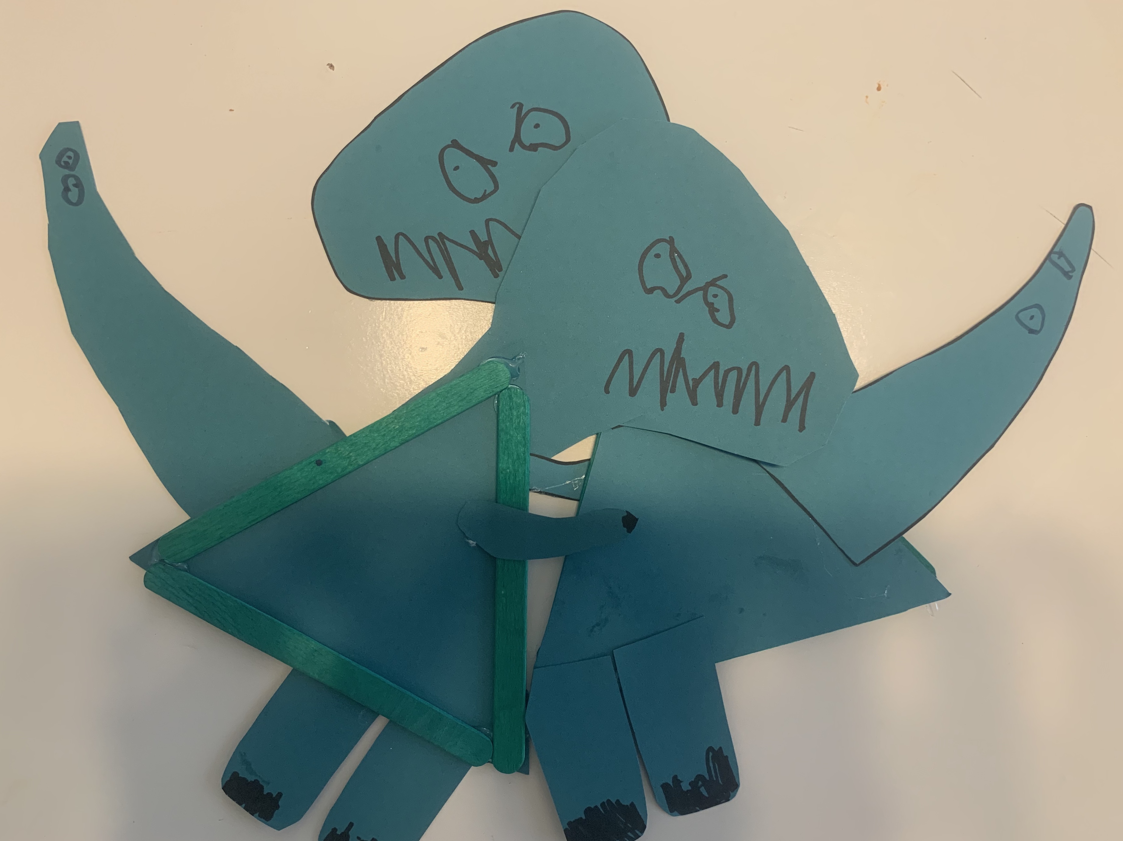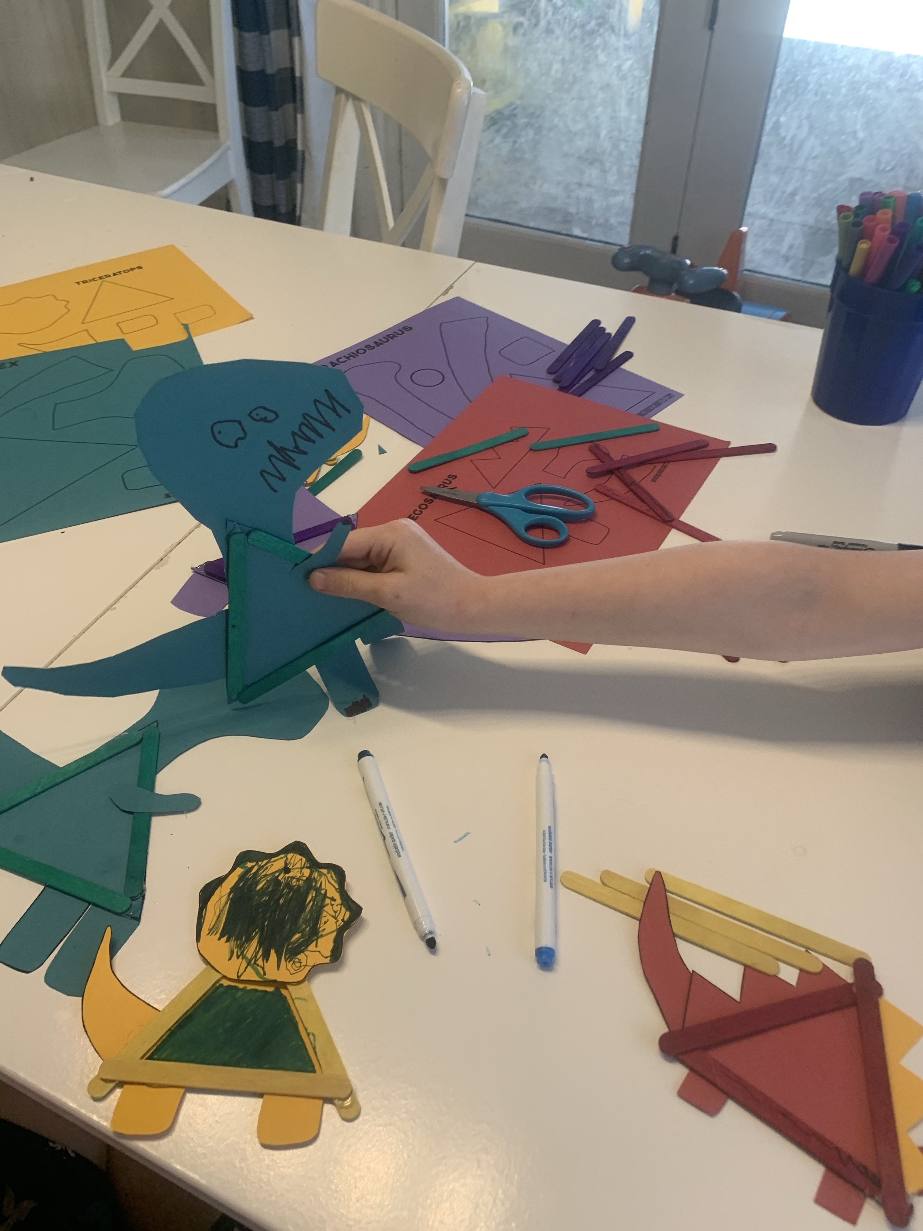 I let the boys cut out their own templates, but I helped with the glue gun and sticking the popsicle sticks around the edge of the triangle bodies. To be honest they probably could use it themselves, but about a year ago I mentioned it was dangerous, and William lives for a rule and never forgets anything. Every time I get it out he mutters, “that’s too dangerous for kids to be involved” and frankly I’m not ready to explain to him that he can do it now, in case he starts sorting through all the other stuff I’ve ever told him is too dangerous, and he wants to do all that too. Mr “everything in the universe must be blue” busied himself coloring the whole of his yellow triceratops blue with a marker. This took him forever, and it wasn’t even blue at the end of it, More a murky green, but he was happy!