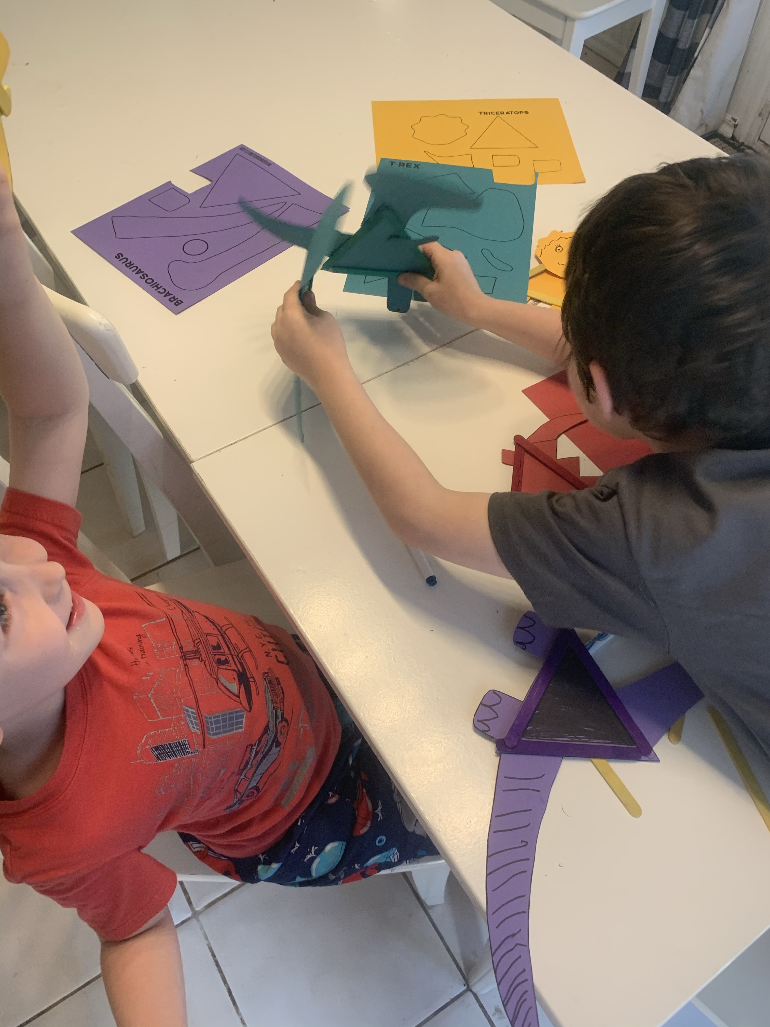The boys chatted as they worked, and decided that their dinosaurs were super hero dinosaur best friends. William made two T-Rexs. I thought they had pretty threatening faces, and when he put them together I told him it looked like they were fighting. He told me, in his very manner of fact way, that they were hugging, and that they couldn’t help their faces. I’m pretty sure my 5 year old just explained resting bitch face to me using paper dinosaurs.