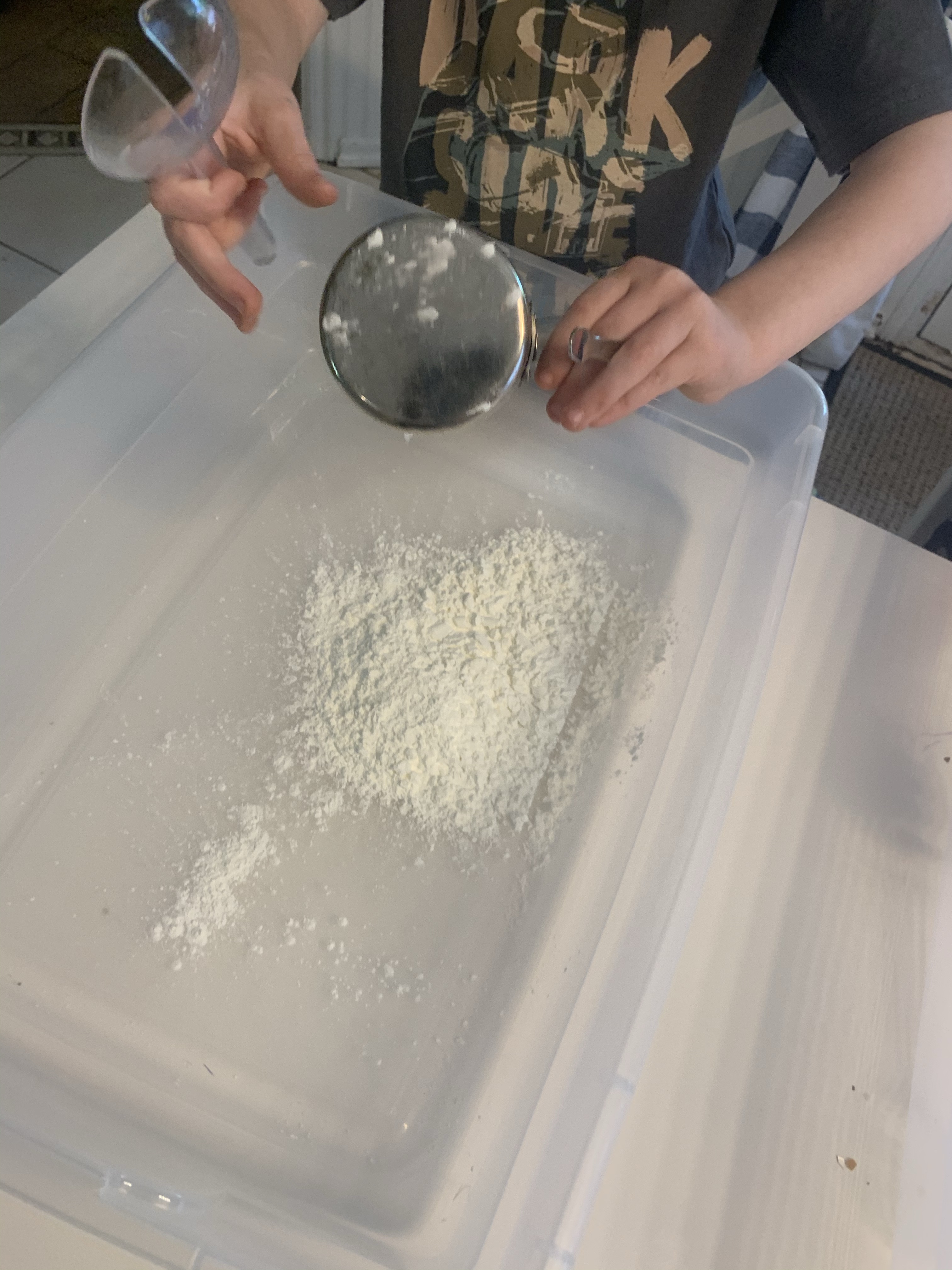 I had a whole stegosaurus math activity planned for academic time, but the boys had had such a wonderful morning playing together with their popsicle stick dinos that I decided to forgo it for something more entertaining that Arthur could do too. I’ve wanted to get tuff trays or messy trays for the boys for a while. However they are ridiculously expensive, for what is basically a shallow box. I read online somewhere that you could get under the bed storage boxes instead for like $5 each. I had ordered 3 last week and they turned up today. Perfect chance to give them a test run!
