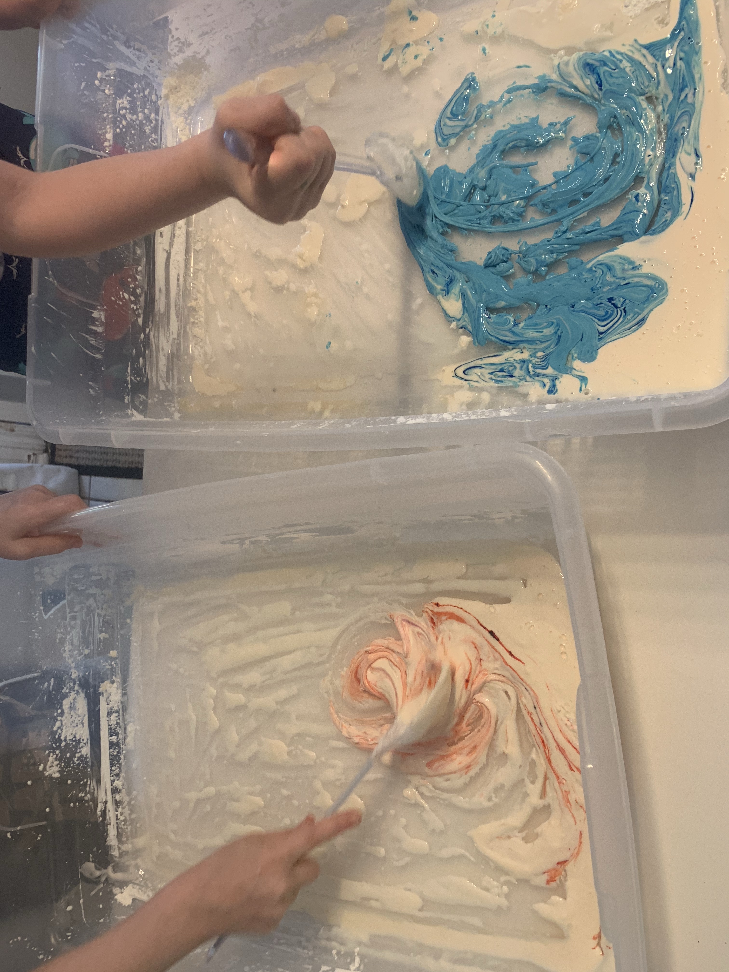 I found a recipe for easy slime online. It is linked below, but basically it’s dish soap, corn starch and water. If you’re in the UK that’s washing up liquid, corn flour, and water. Sort of wish we had a different word for water, just to stick with the theme there. The beauty of this “recipe” is that you can sort of eyeball it and add however much of whatever to get different textures. More cornstarch and it’s like silly putty. More water and it becomes swampy. I let the boys measure out their own stuff and mix it all up. I have the big boys food coloring to add to theirs but I knew Arthur would get his hands everywhere and food coloring spreads like the plague. So he had to accept his without.