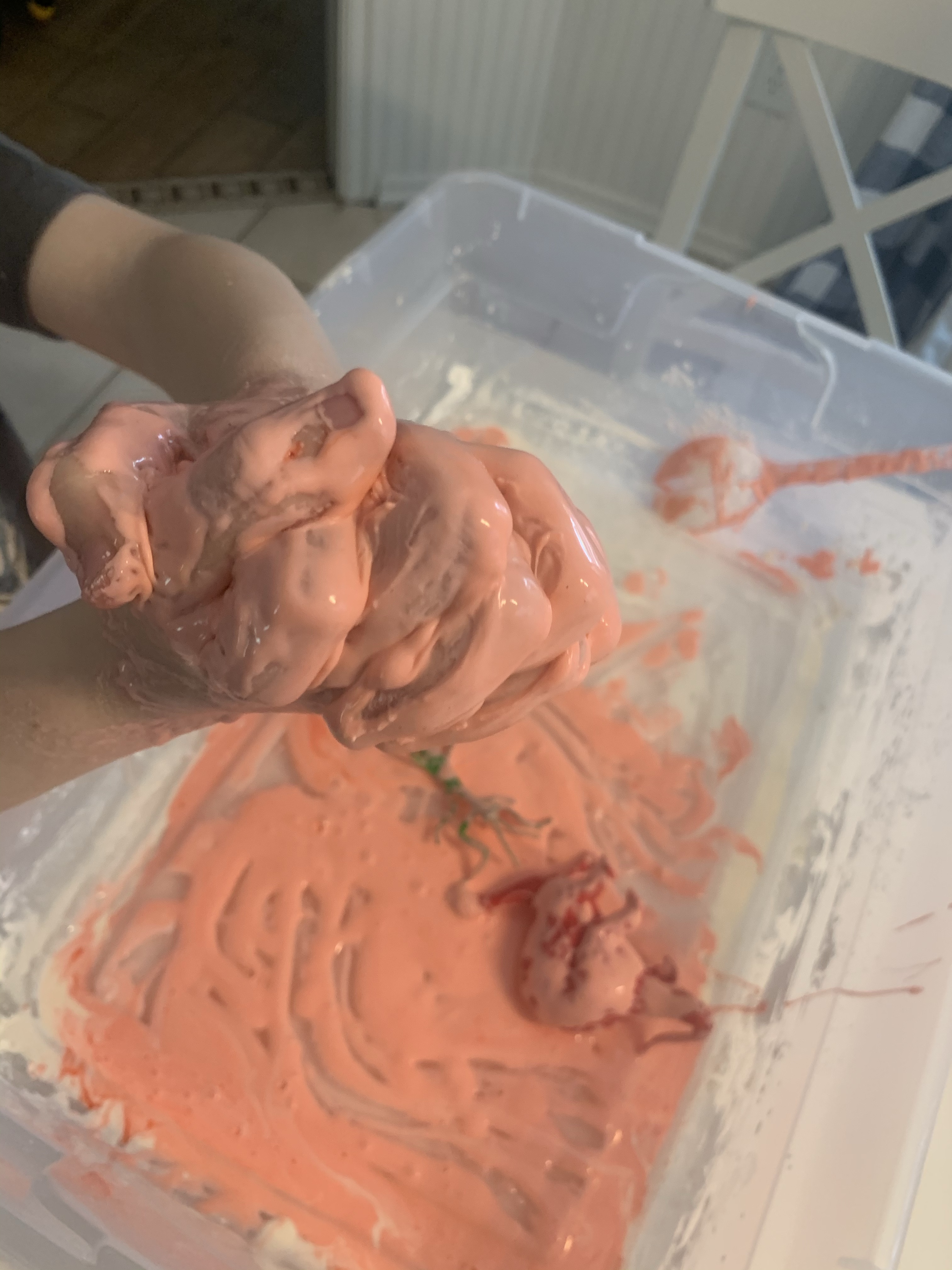 After a while of squishing and squelching all our ingredients together I got our our dinosaur figurine box. The kids chose a few each and threw them into their gloops. I settled down to sort the thousands of socks they wear a week into pairs, and even managed to watch Hulu on our Alexa. Messy play always keeps them occupied the longest. The pay off from having so much tidying up to do afterwards always makes having some time to myself worth it. These shallow boxes are going to be my item of the summer. I can just tell. Perhaps I’ll manage to watch the whole of Marple before they get bored of slime this year. A girl can dream. Join us tomorrow when we plan on taking the messiness outside. The weather is meant to be lovely, and after today I’ll want to save my kitchen table from another hammering.