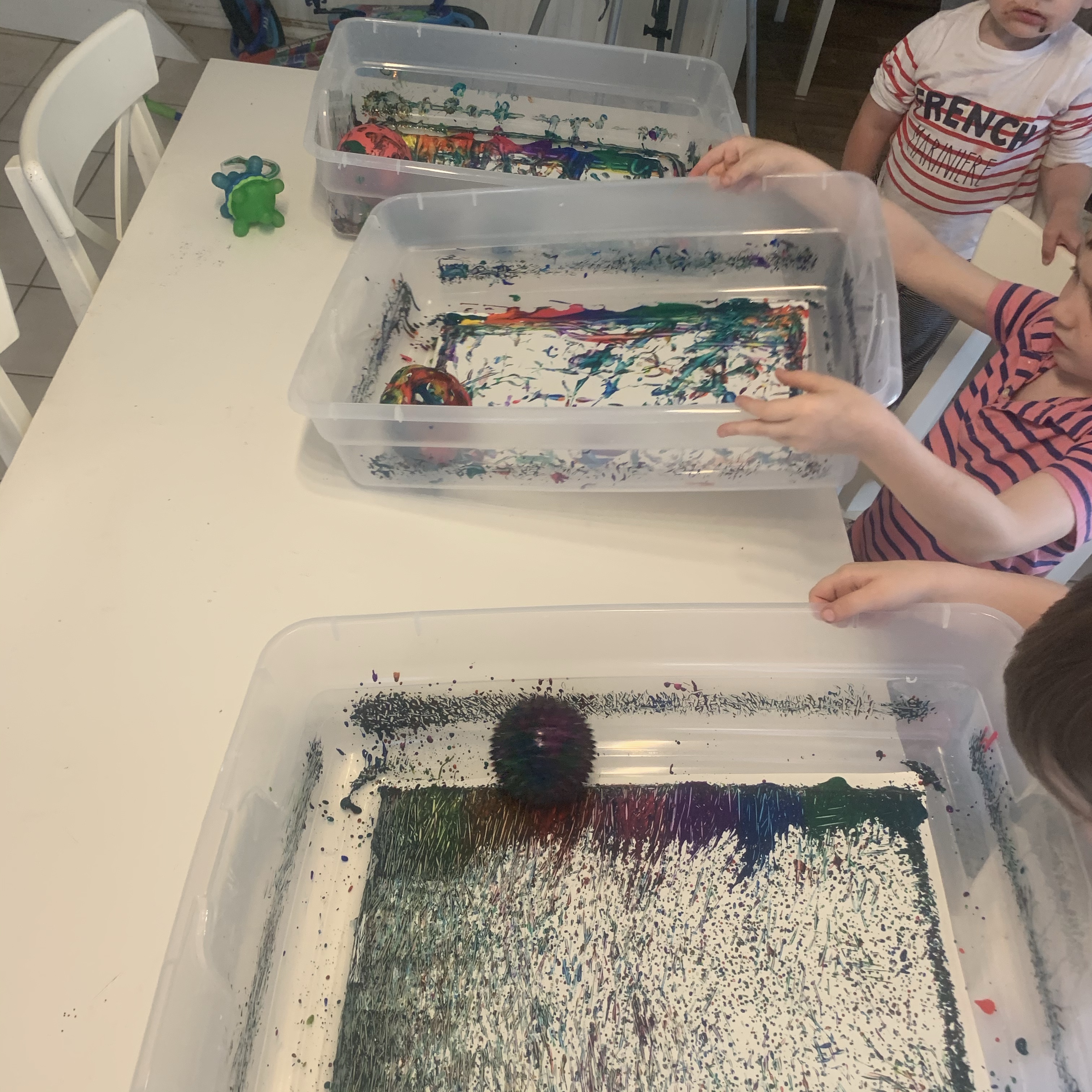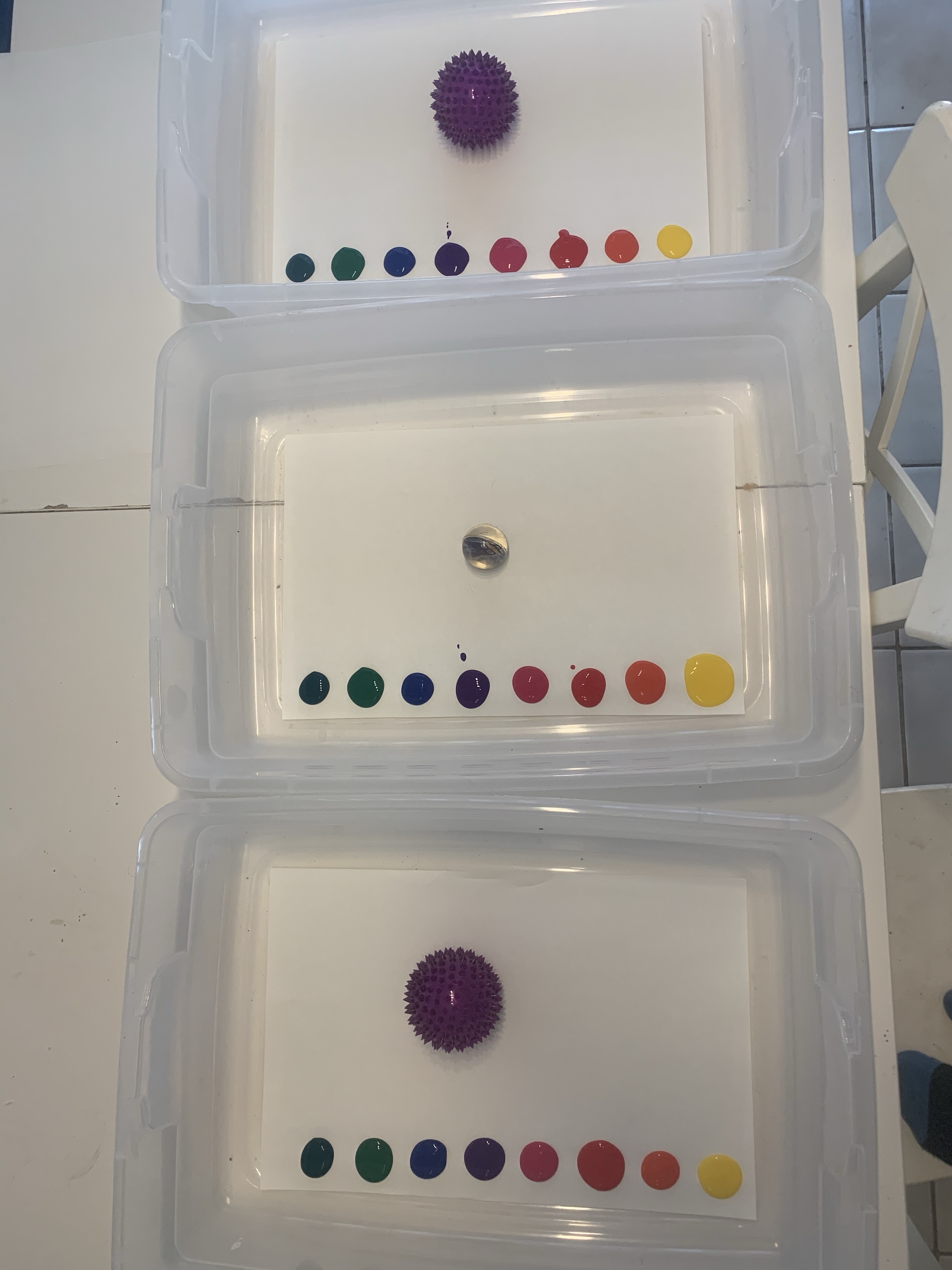 I lined the trays with paper and taped it down on the edge to stop it sliding. Then I dolloped some kids paints down the side and gave the boys a ball each. We have a whole basket of different balls, all with different textures. To start with Teddy chose a spiked ball, and William used a large bowling ball.