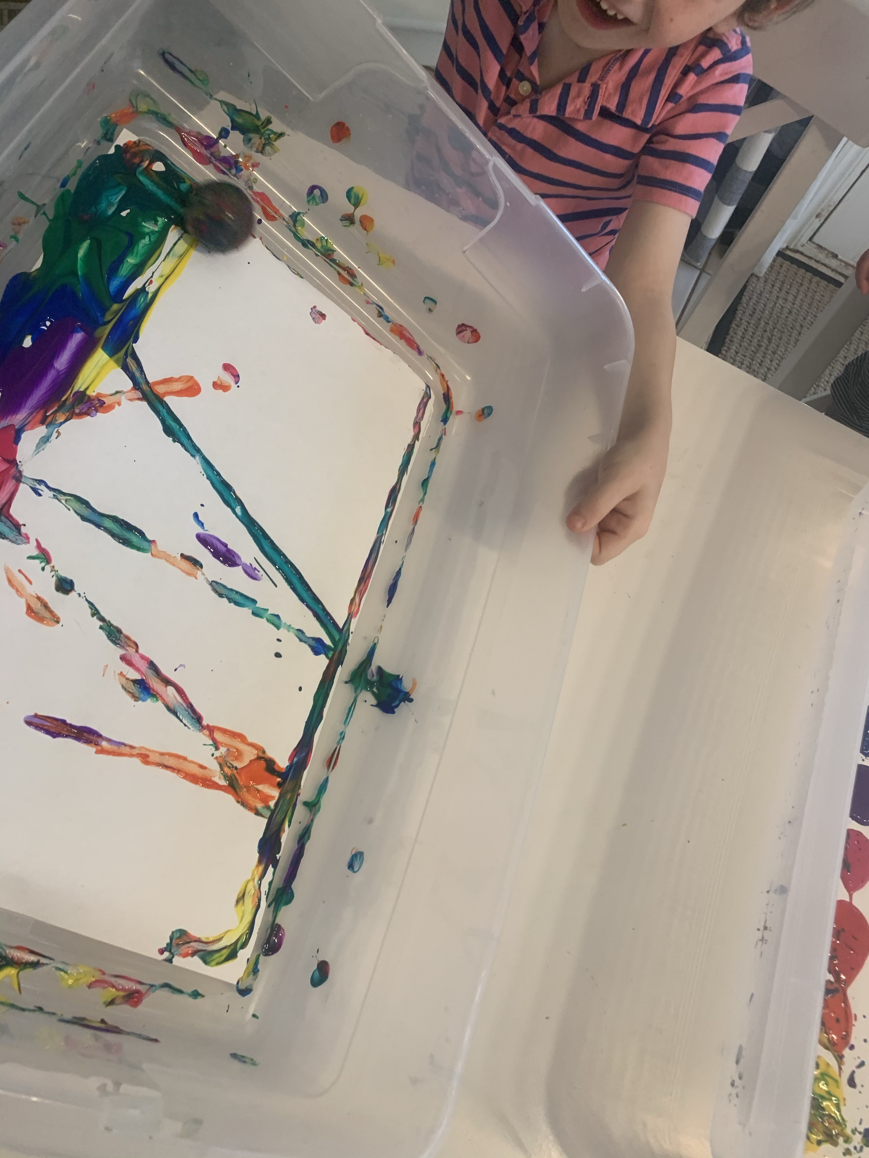 I had plenty of extra paper on hand, so that whenever the boys wanted to switch balls I could give them a fresh piece of paper to do a new pattern. However Teddy saw what a very neared dotted pattern his spiked ball was making, and decided he couldn’t give it up. He spent our entire craft time gently rolling it back and forth through the paint. My rush ahead and deal with the mess later son on the other hand used every single ball on offer, dropped a couple on the floor and spread some paint there, then got it all over his hands. Same parents. Same activities. Two very very different human beings.
