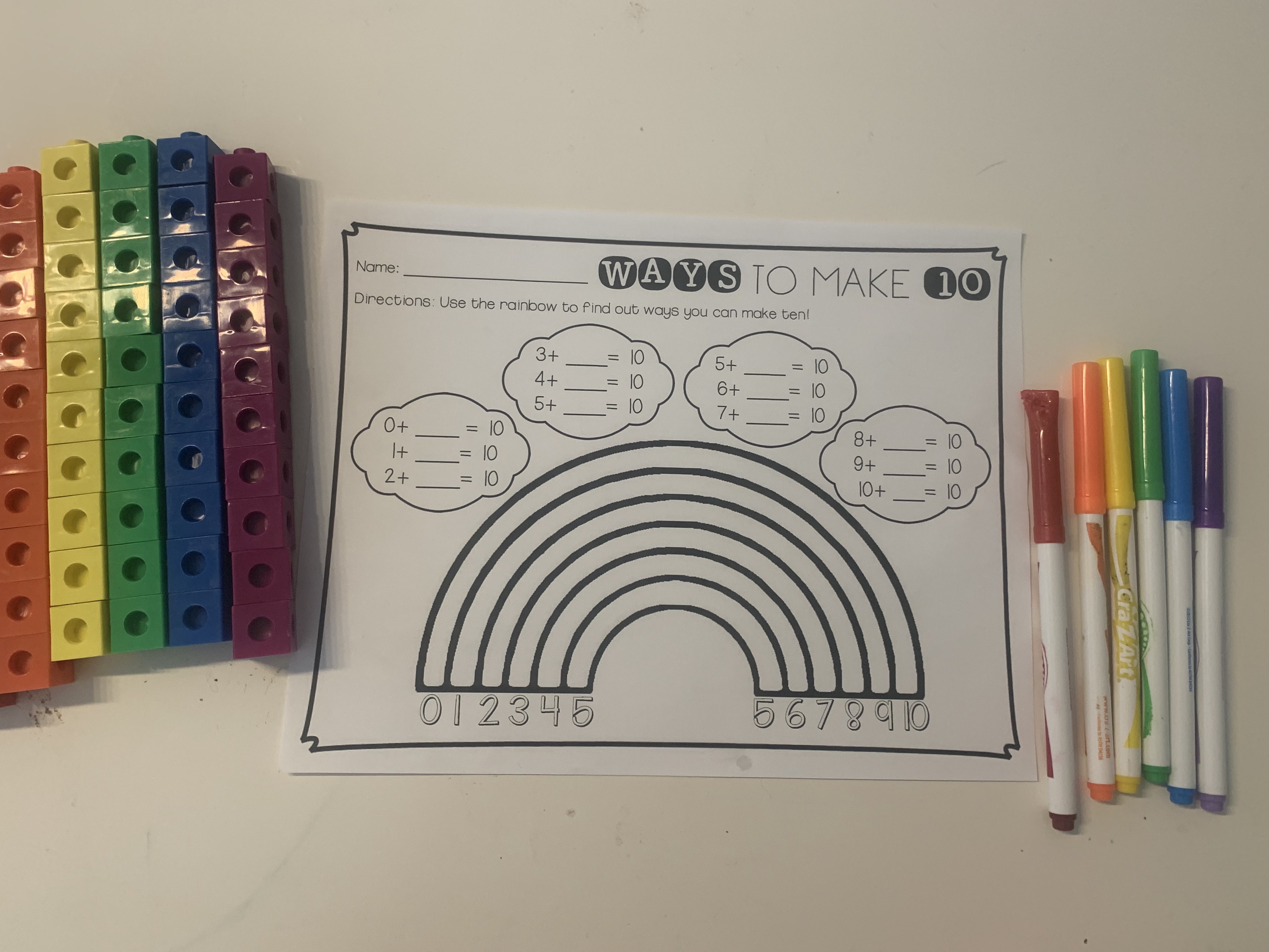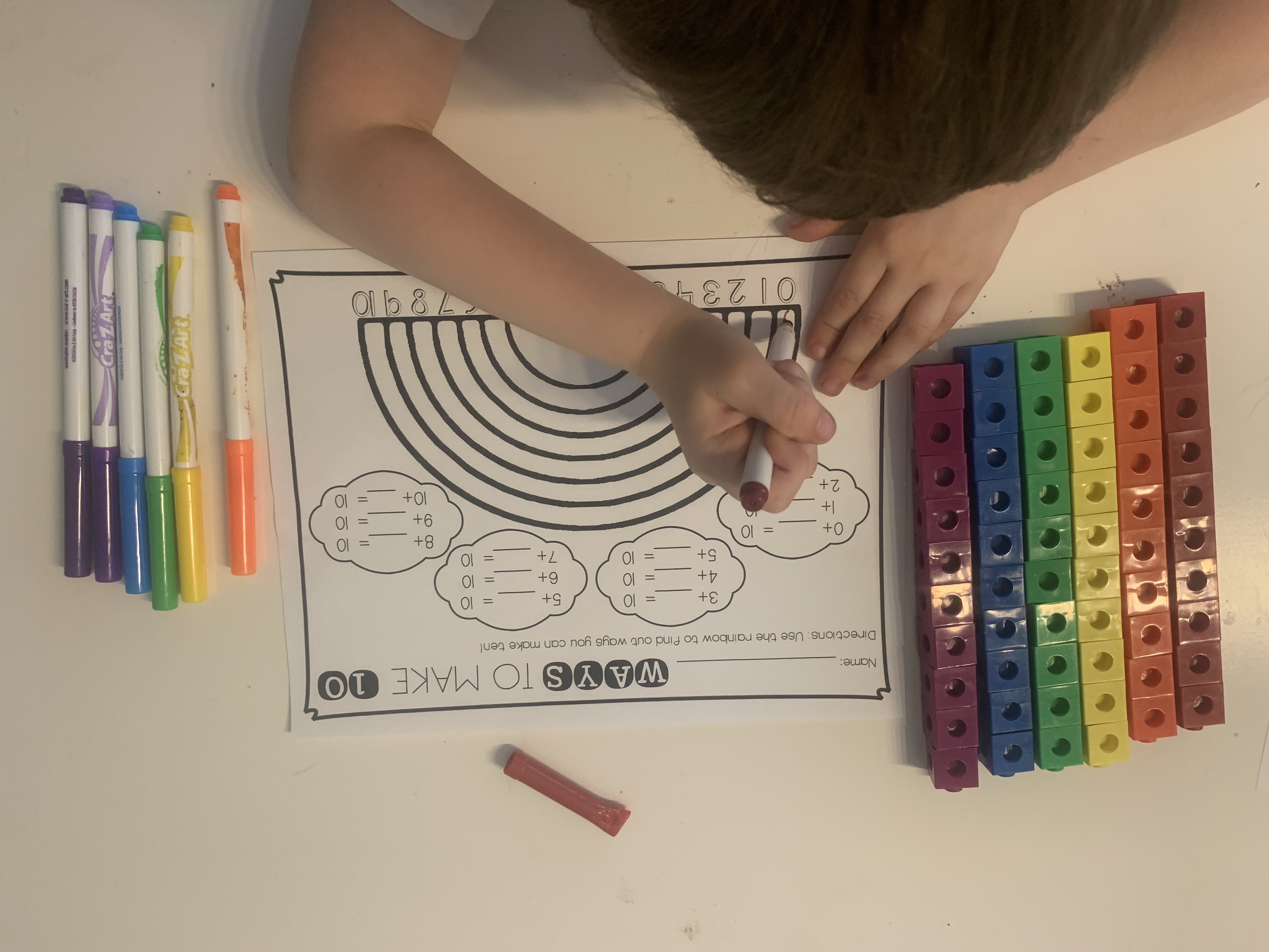For teddy I had a rainbow worksheet that helped show him the number bonds to make 10. He spent a huge amount of time coloring his rainbow in very neatly. They had watched a Ryan’s world video on rainbows earlier today.l, and he was a little peeved the sheet didn’t have 7 spots for colors and he had to forgo his violet. But he rallied. I gave him his number blocks to help give him a manipulative to form the groups to make 10. It really helped, and he filled in his sheet carefully and slowly, checking with his blocks as he went. He then insisted on using all the colors in the rainbow to write his name at the top. He’s so creative, and careful and neat. I can’t wait to see how he shines in Pre K this fall.