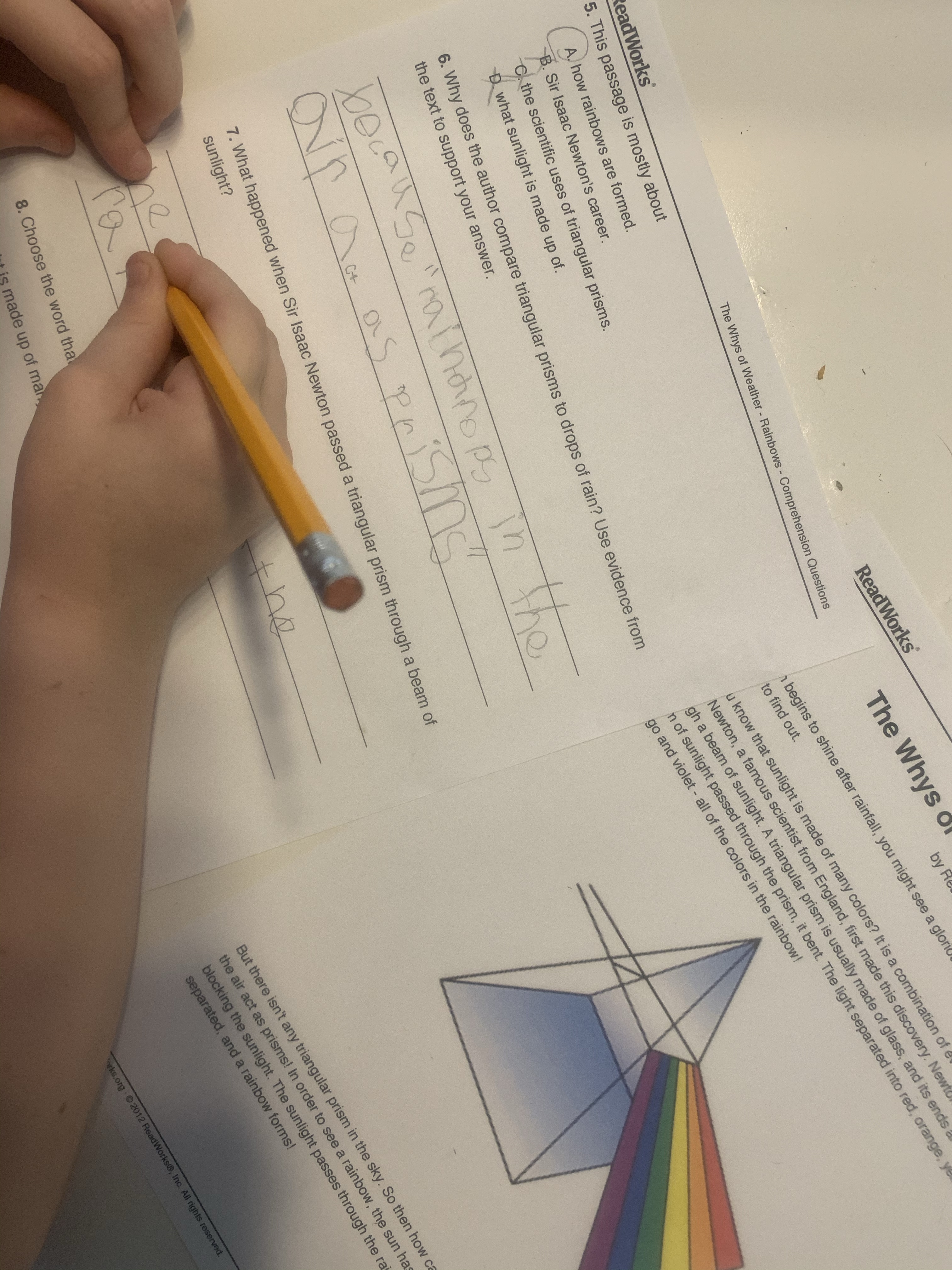The real beauty in using trays is that when you’re done you can put them to the side and worry about clean up when you have a moment. So whilst the momentum was going I got out their academics. William had a fab readworks which was exactly his sort of thing. Lots of talk of prisms and the science behind how a rainbow is made. I was so proud of how hard he focused. He rattles through multiple choice questions, so I’ve started showing him some testing strategies like crossing out options you know are not the right answer. Even if he can choose the right answer for the comprehension sheets he’s doing right now, it’s important to have these strategies in his tool box for when he has to answer questions he’s not so confident on. I think next week I’m going to start getting him to underline evidence in the text. Maybe I’ll give him a highlighter. He goes crazy for a highlighter. Today was also a pretty fab day for comprehension because for the first time ever he pulled his evidence from the text and remembered to use quotation marks. I was so proud of him, and how far he’s come in the past few months.