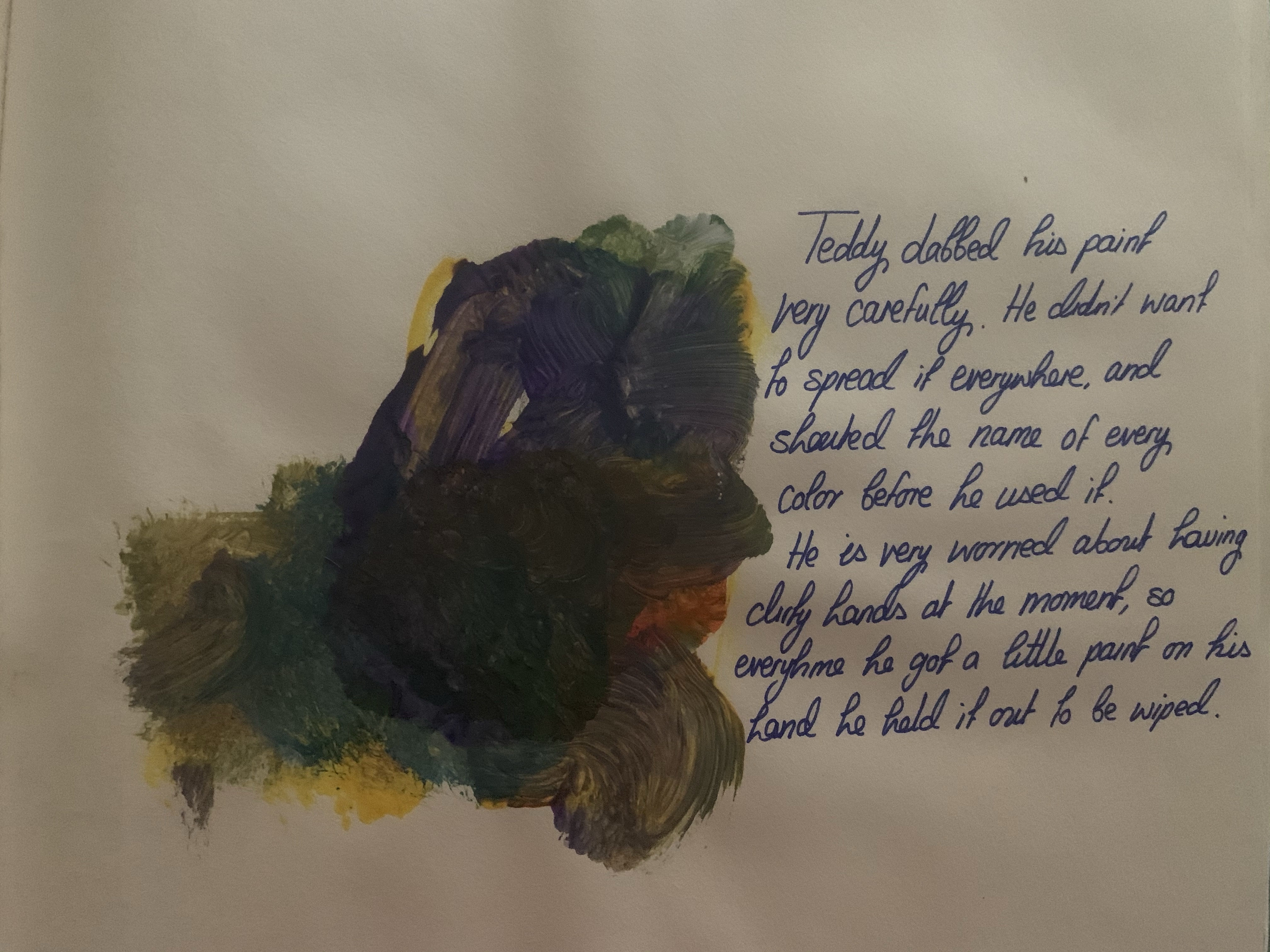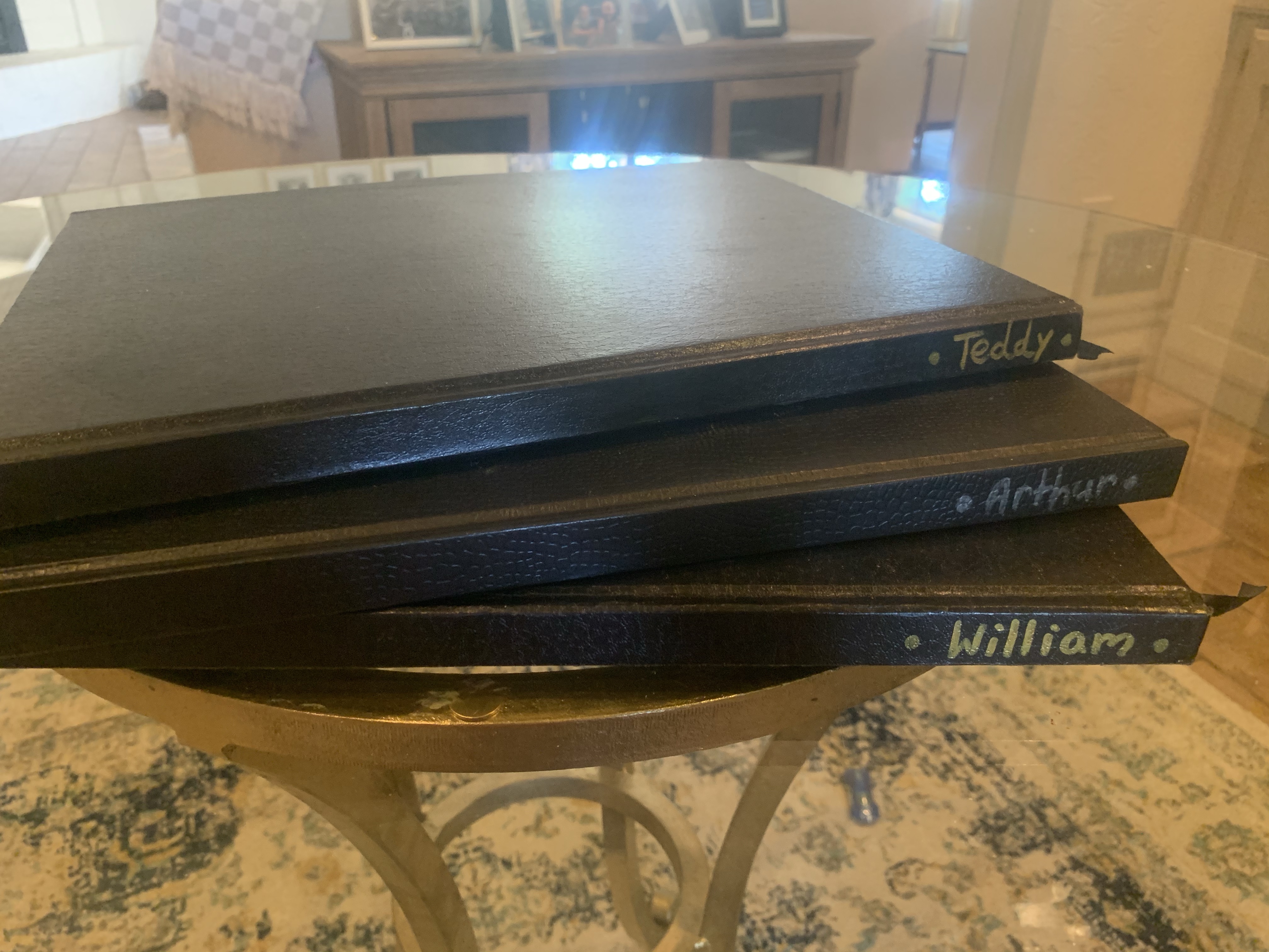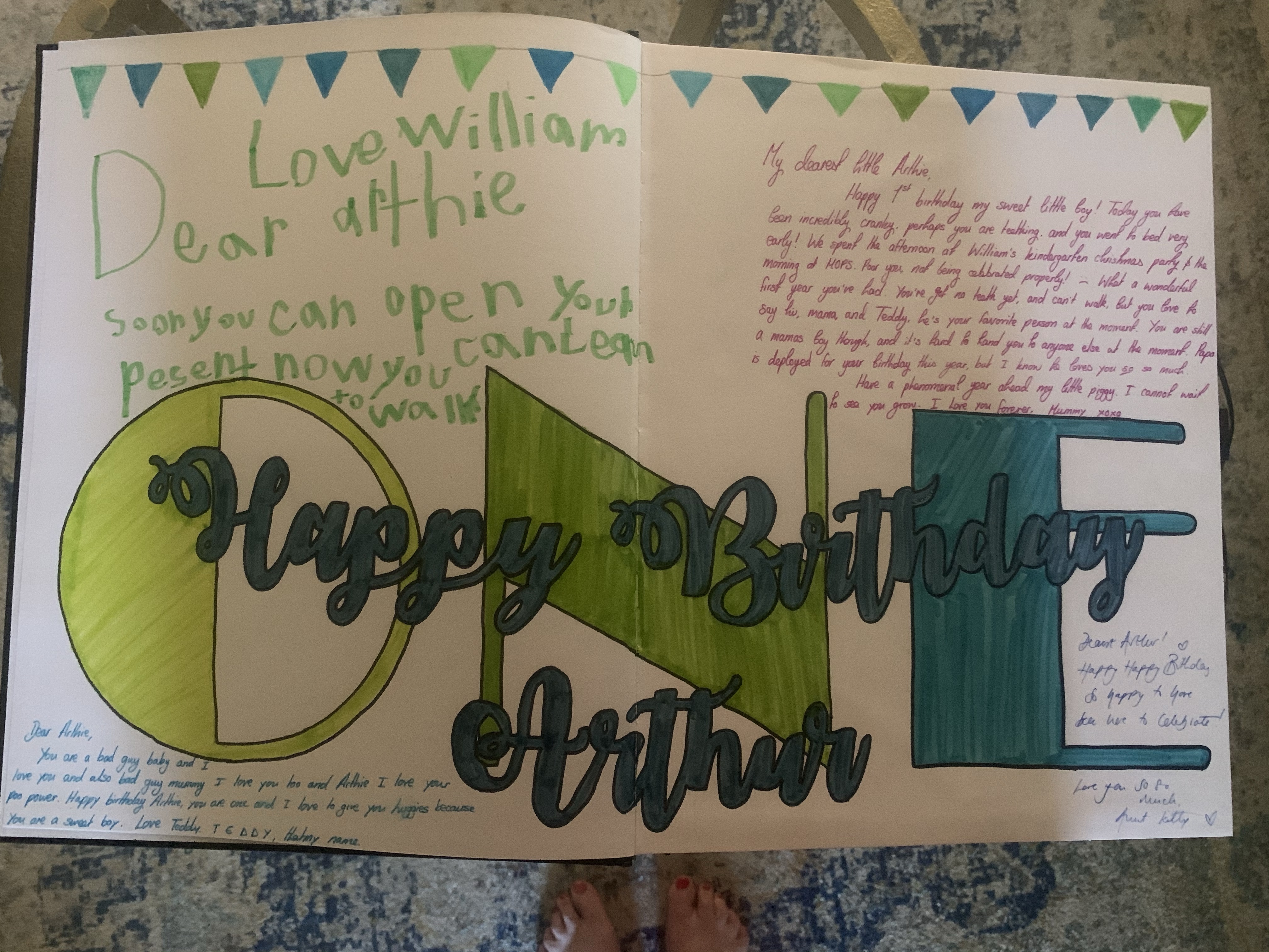 Here’s how it works. When one of my kids has a birthday we do not rush out to the card aisle in Target and sort through thousands of brightly colored cards saying “have a super day!” with Iron man on the front. Instead I open up that kid’s book to a double page. Then I do a big “William is Three” Or “Happy birthday Arthur” background. Then I find a time to grab everyone before the birthday, and they come and write their message to whoever birthday it is. On the birthday they have their presents, with the book open on the top for them to read and look at when we have breakfast.