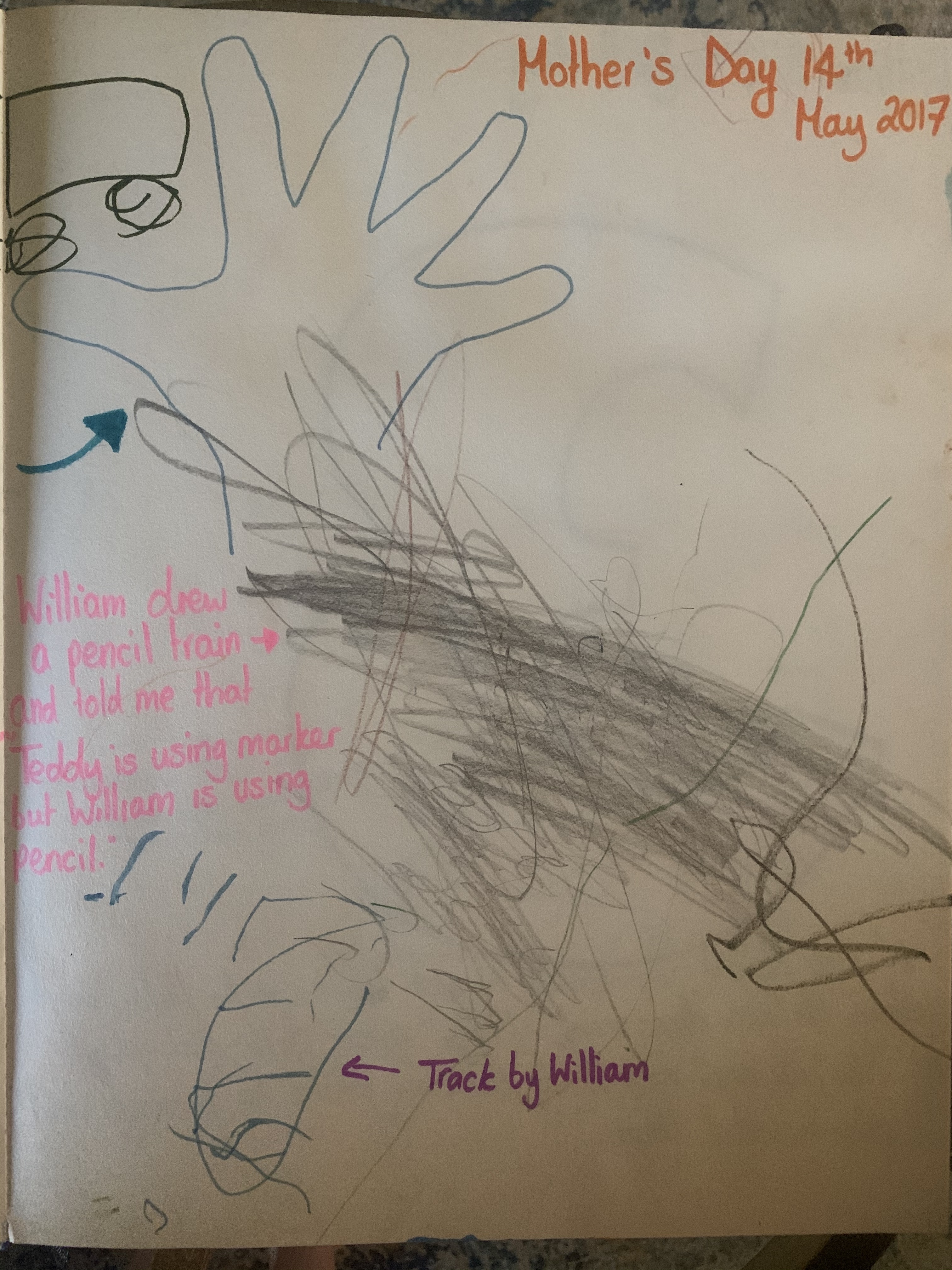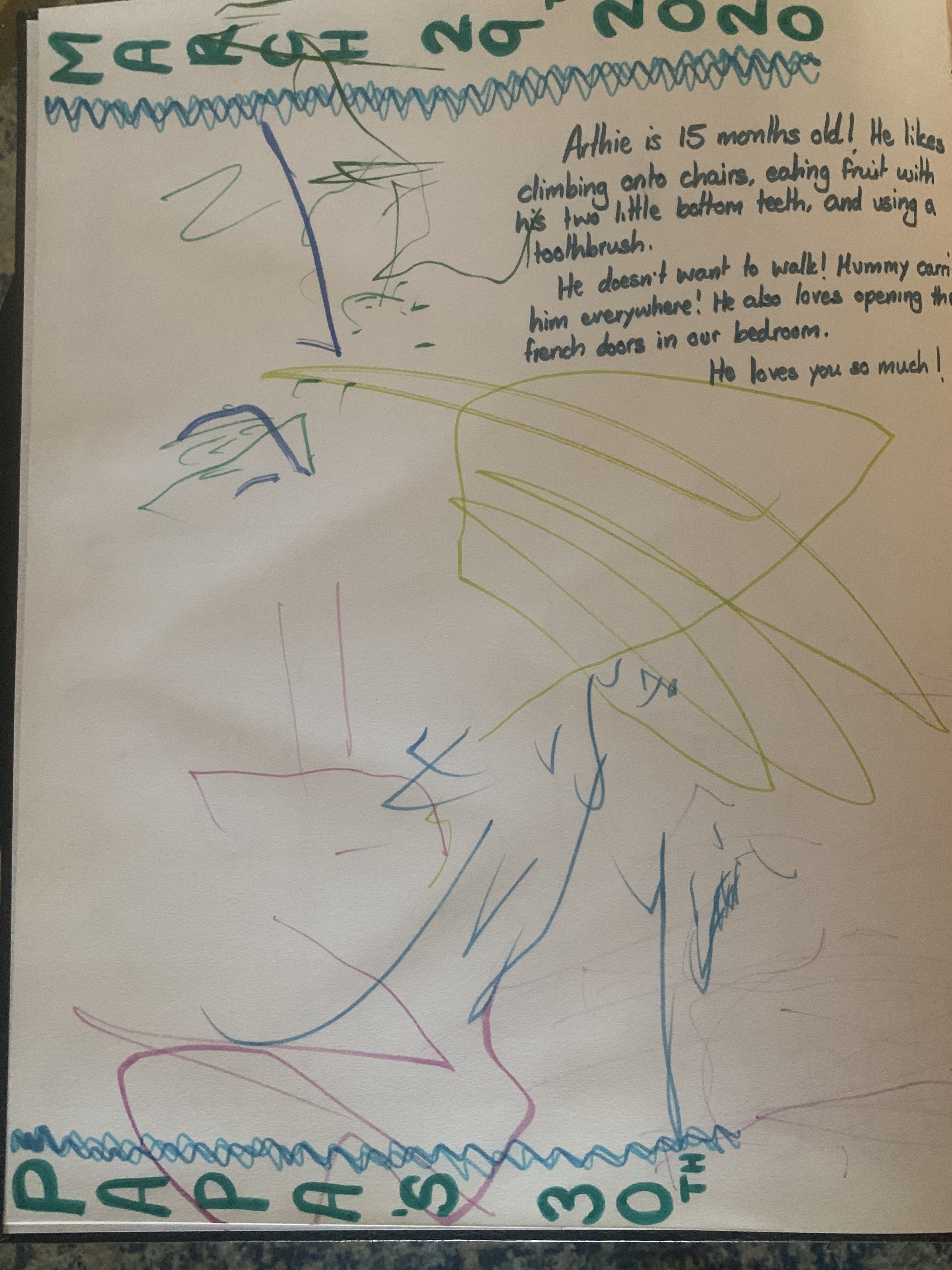 Next week William is turning six. So it’s been six years of doing this. At first it seems a bit weird. Especially the first time, when you have a huge book and just one drawing in it. However trust me on this, stick with it, because flicking back through them and seeing all the wonderful memories, and how the boys have grown creatively, but also how their relationships with each other, and the things they’ve wanted to share each year, make this invaluable. If you move a lot I also recommend moving them in your car, in case the movers lose them!