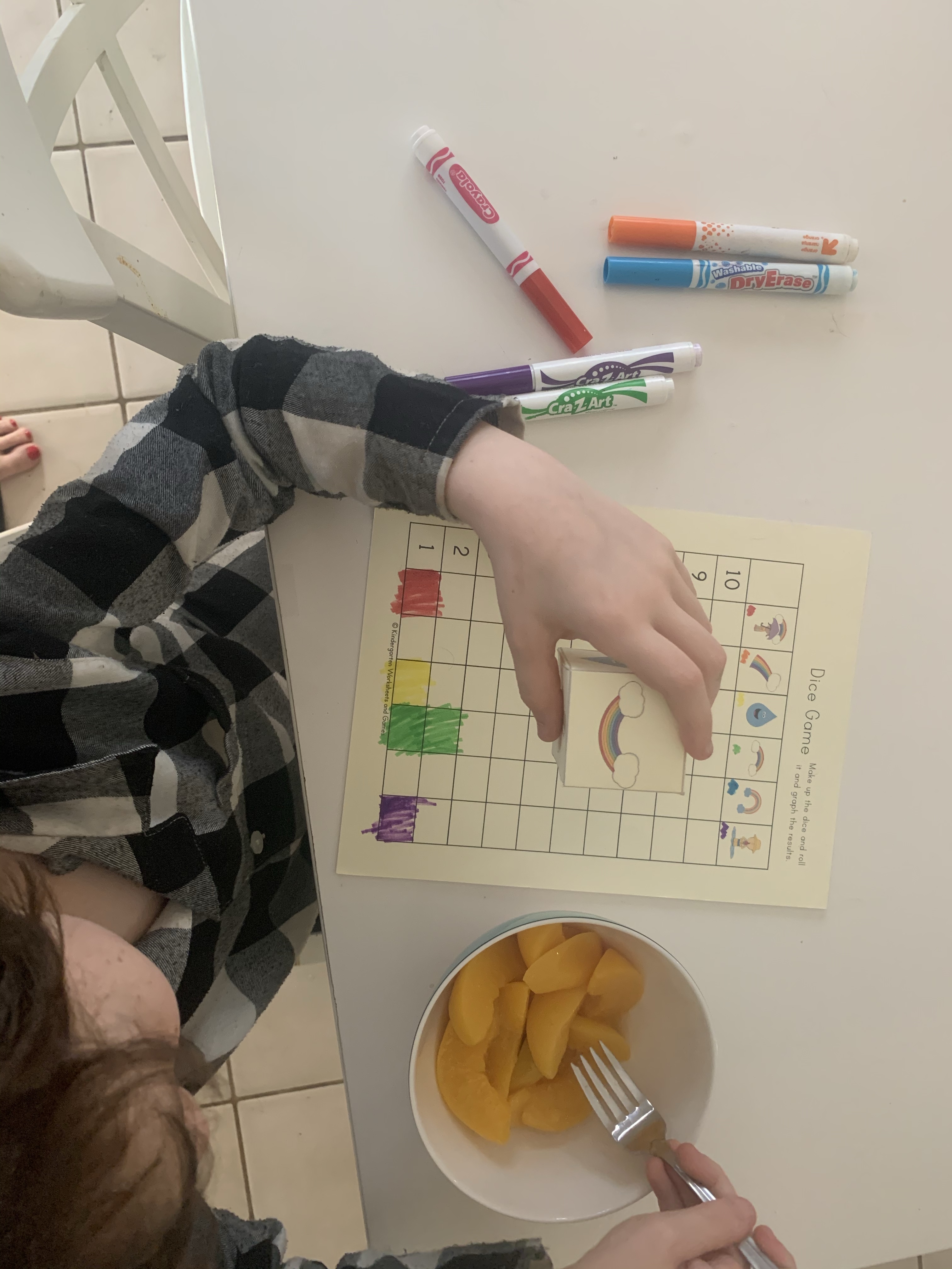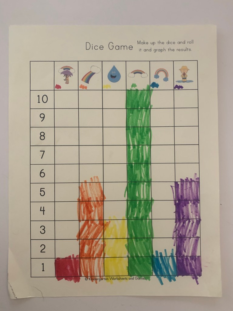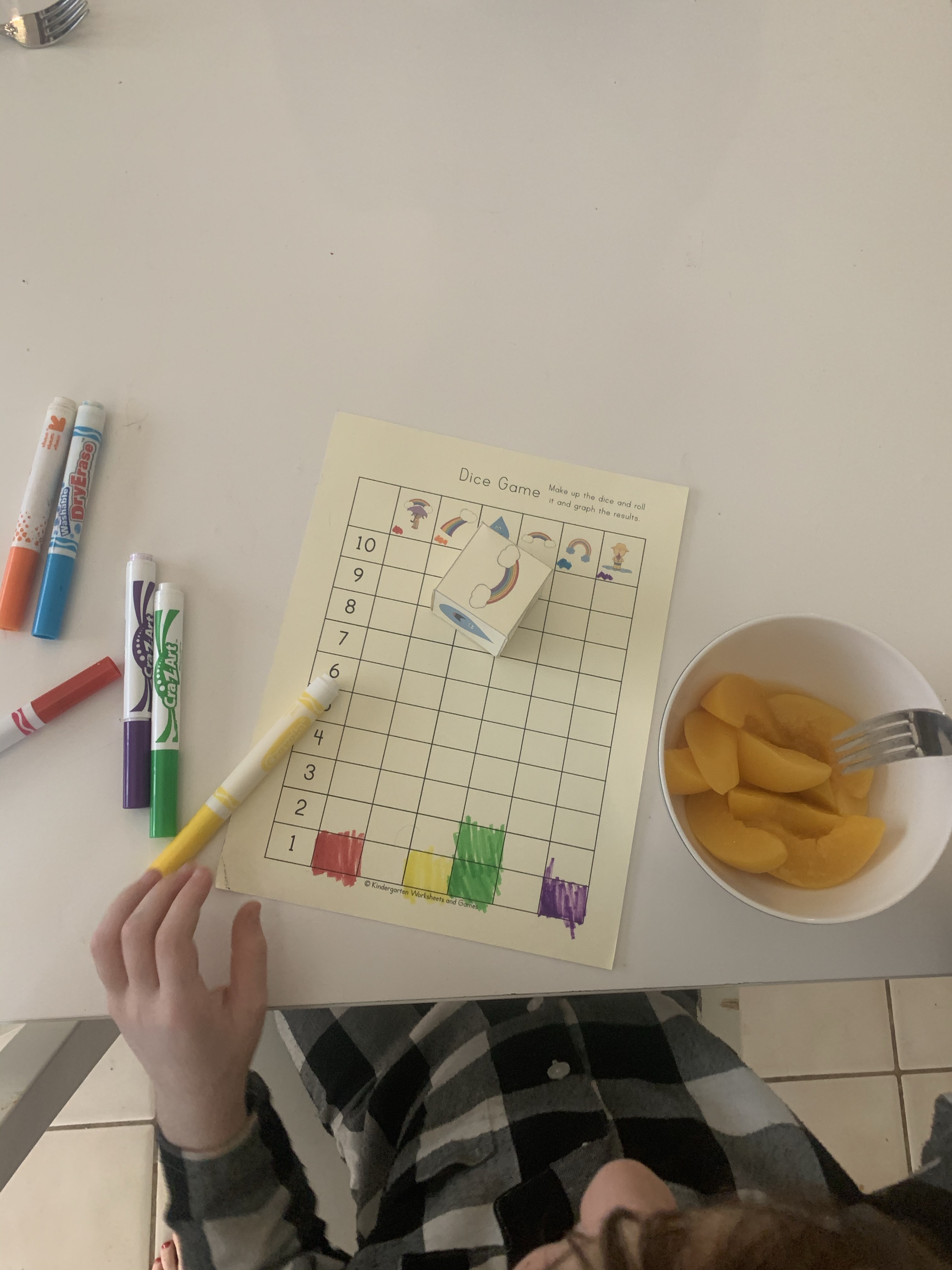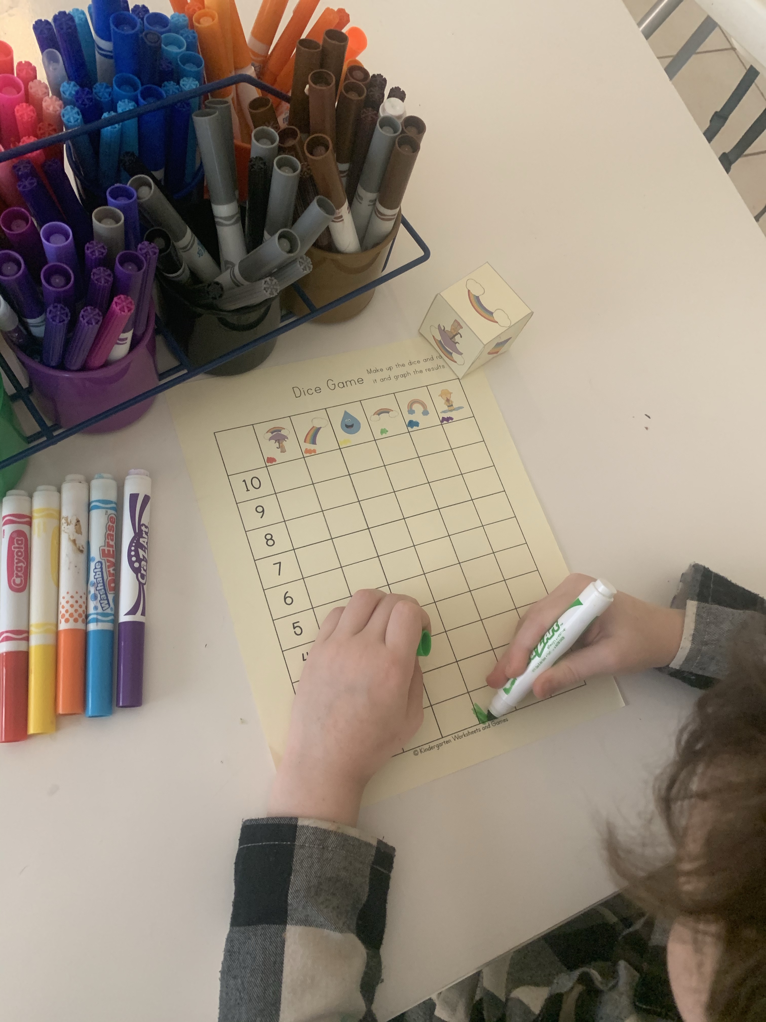 Todays academic time came to us from a really phenomenal rainbow themed activity pack that I found online. Its absolutely packed full of ideas and printable for kids to enjoy. There are a TON of choices but I only picked 2. For William I chose a probability dice game. It’s pretty easy to set up. Print the two pages with the bar graph, and then the template for the dice. William gathered pens in rainbow colors as we chatted about probability and the basic statistics behind rolling a dice. Both the big boys are very into math, and alway sheen to do any worksheet that’s math based. I’m so thrilled they like it. There is so much negativity around Math as a subject. People are always so quick to proudly exclaim “Oh I’m so bad at math” to anyone and everyone. Can you imagine if you just told people “I can hardly read.” You just wouldn’t, because literacy seems to have an importance added to it, people keep very quiet about having poor comprehension skills. On the other hand it’s socially acceptable to be bad at numeracy. I think a ton of this is cultural, we are just taught that math is harder, and that we will struggle. Start young with making math fun. You’ll never regret it.